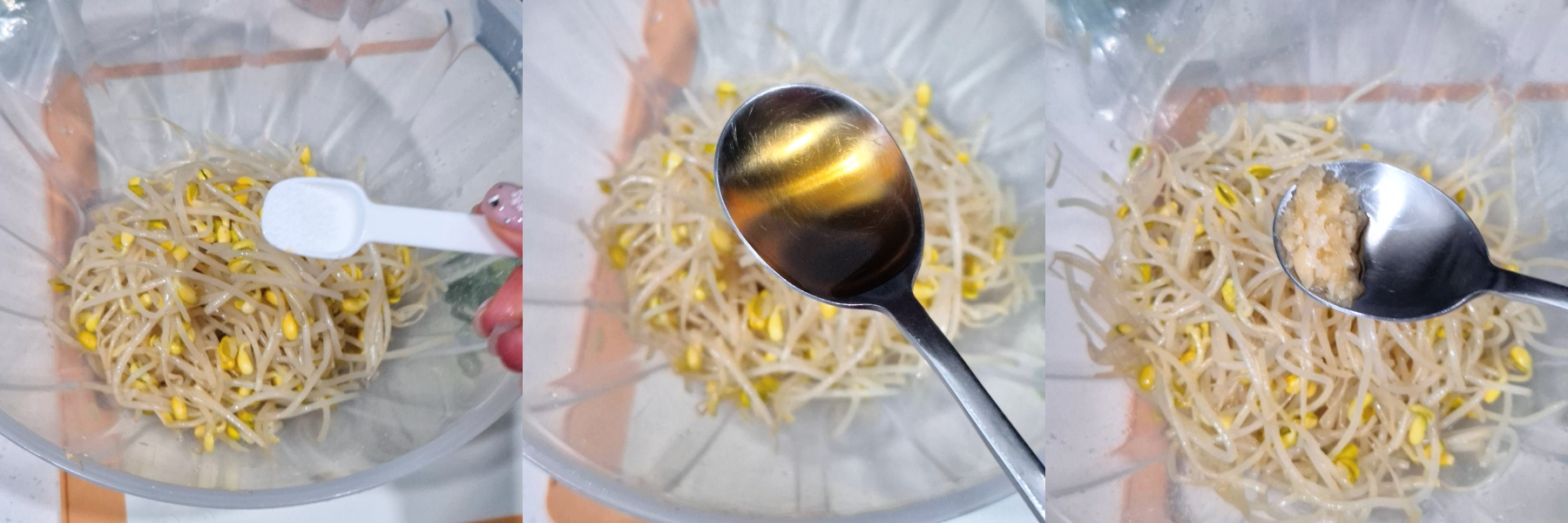 깊은 보울에 콩나물을 넣고 소금 0.5작은술, 참기름 1큰술 그리고 다진 마늘 0.3큰술 넣어주세요.
