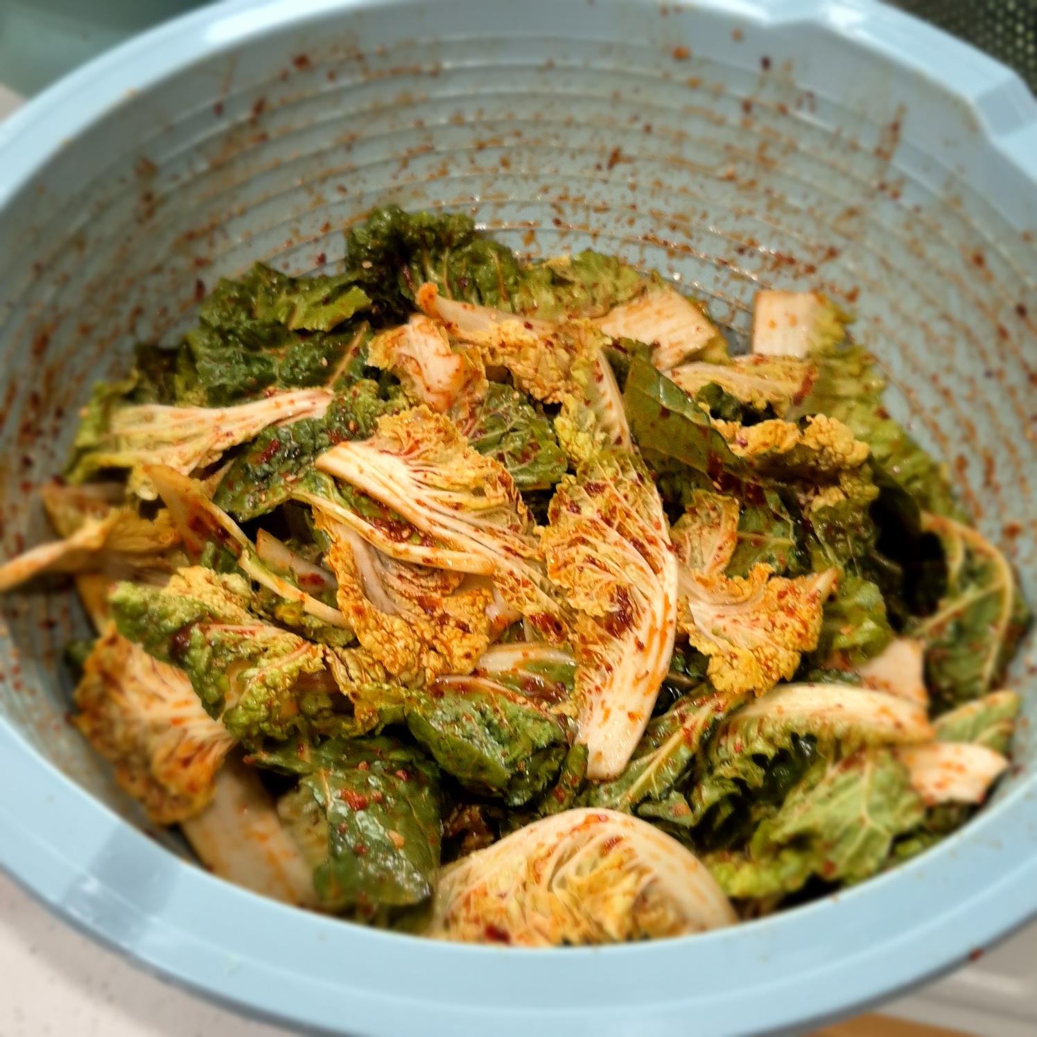 부피가 커서 버무리기 힘드니 준비해 놓은 봄동의 절반만 넣고 1차로 버무립니다.