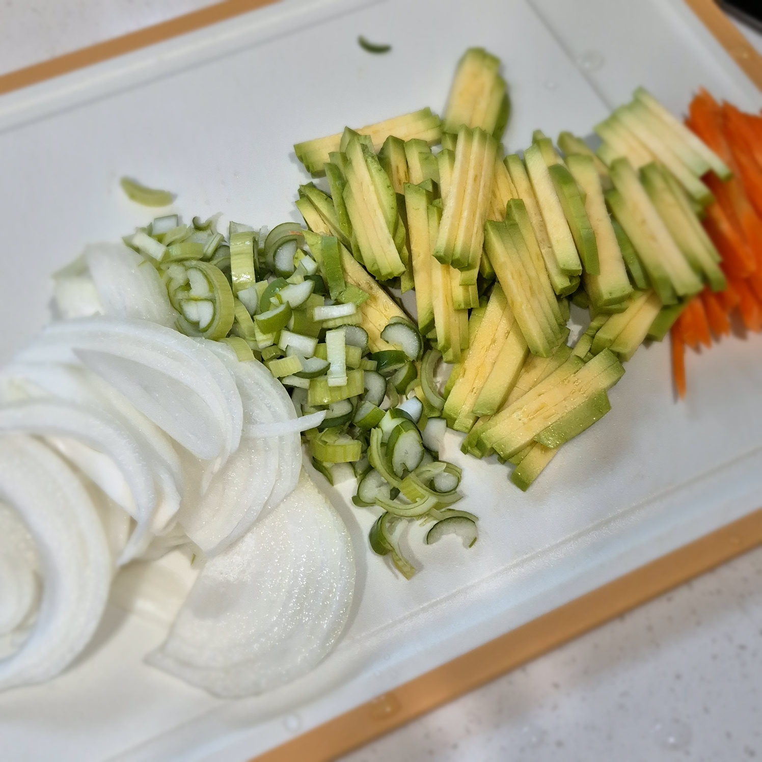 양파와 애호박, 당근을 채 썰고 대파는 송송 썰어서 준비해 주세요.