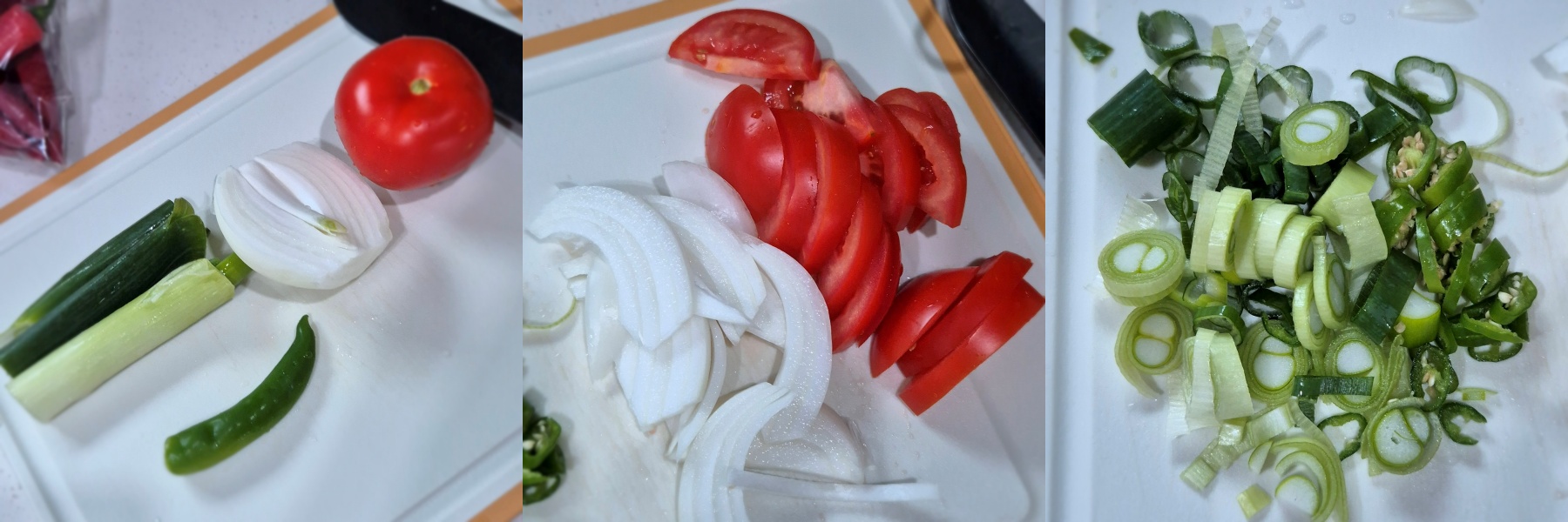 토마토와 양파는 채 썰고 대파와 청양고추는 송송 썰어주세요.