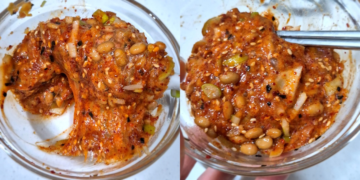 쌈장 1큰술, 다진 파 1큰술, 매실청 1큰술, 다진 마늘 1/2큰술, 고춧가루 1/2큰술, 통깨 1큰술 넣고 나또에 들어있는 간장과 김가루까지 모두 넣어주었어요.