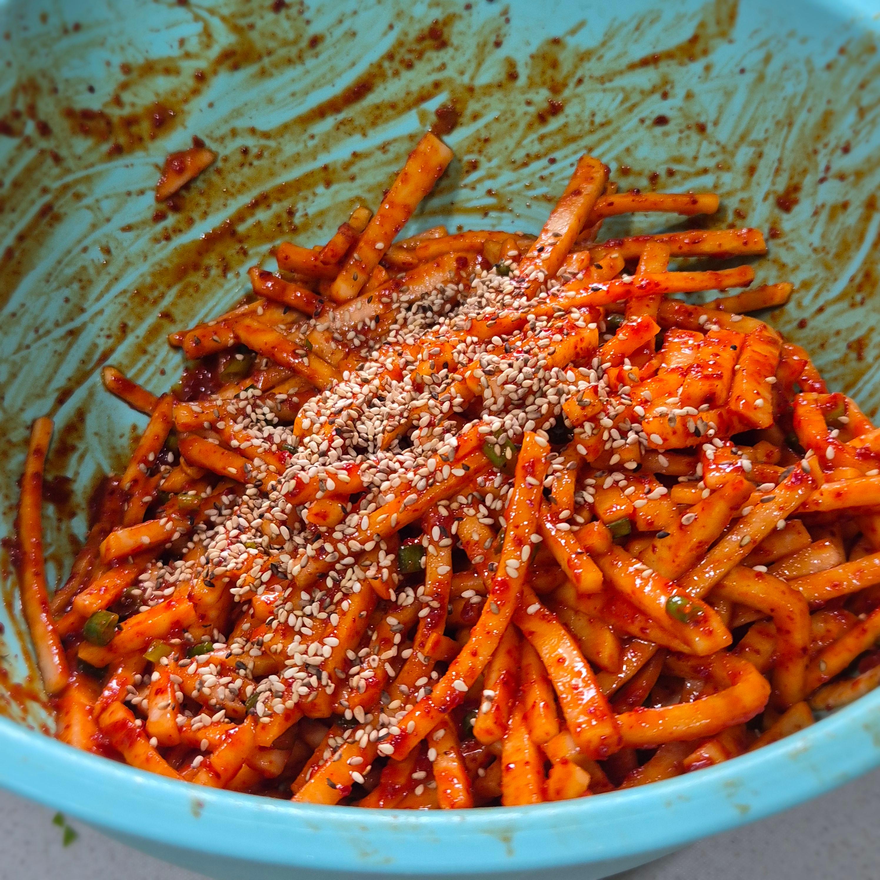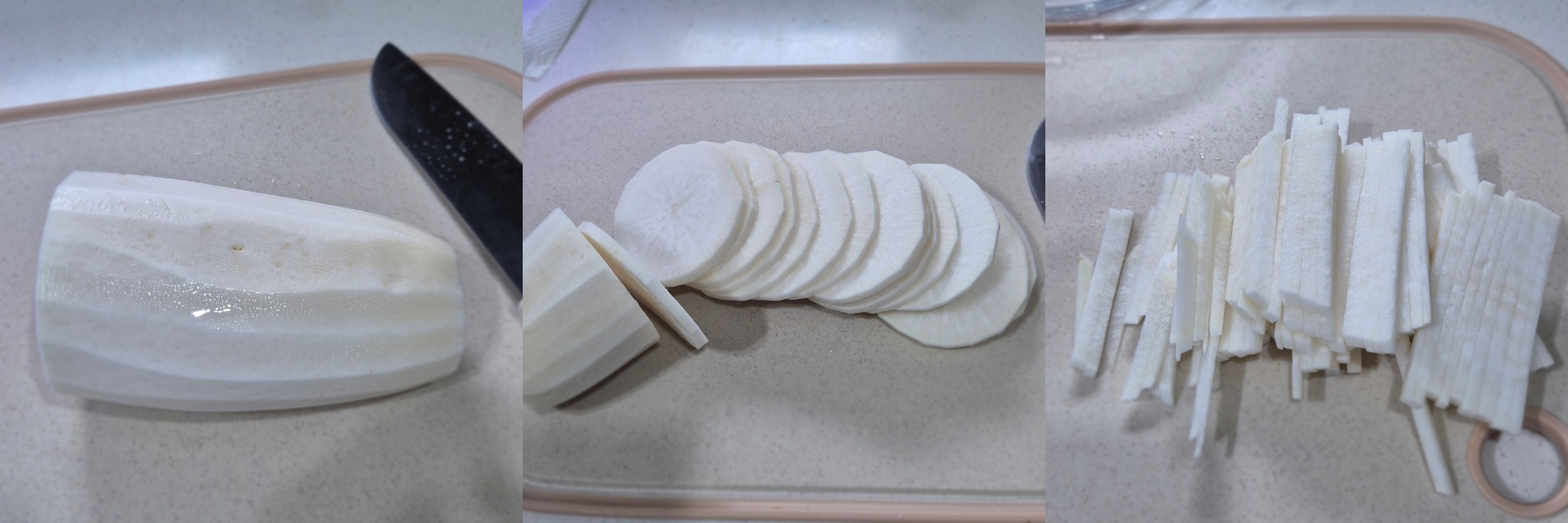 저는 무채는 조금 씹는 맛이 있는 게 좋아서 너무 얇지 않게 잘라주었어요.