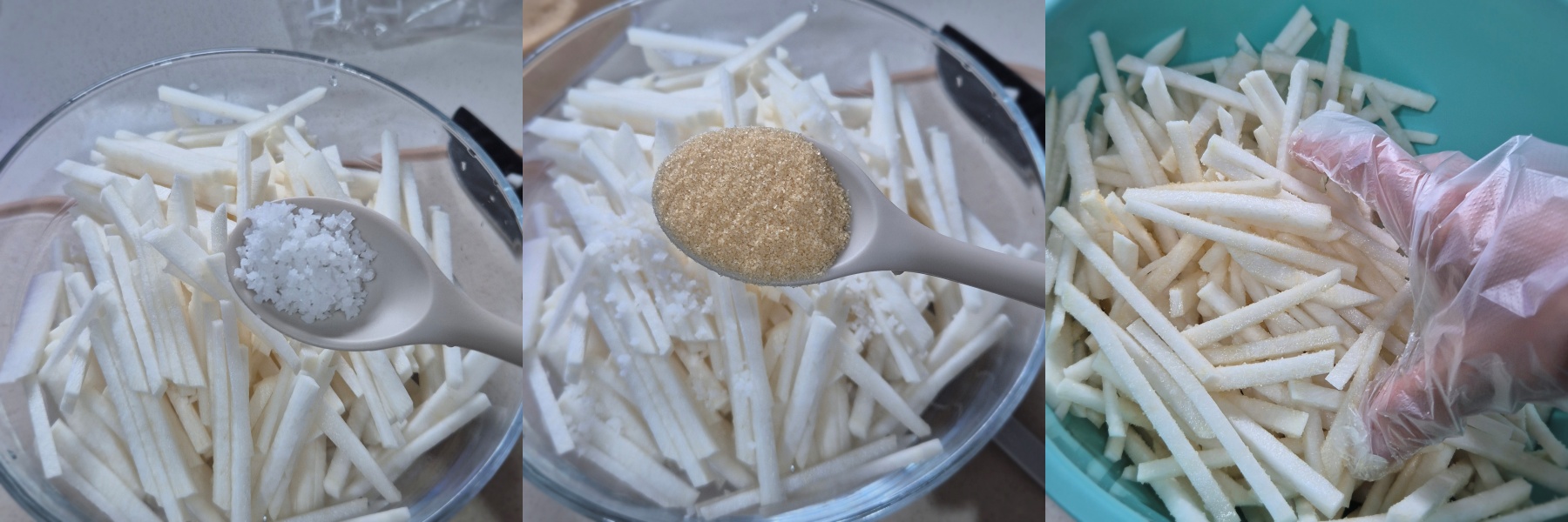 큰 보울에 무채를 넣어 준 다음 천일염 반 큰 술과 설탕 4큰술 넣어 수분이 나올 때까지 버무려줍니다.