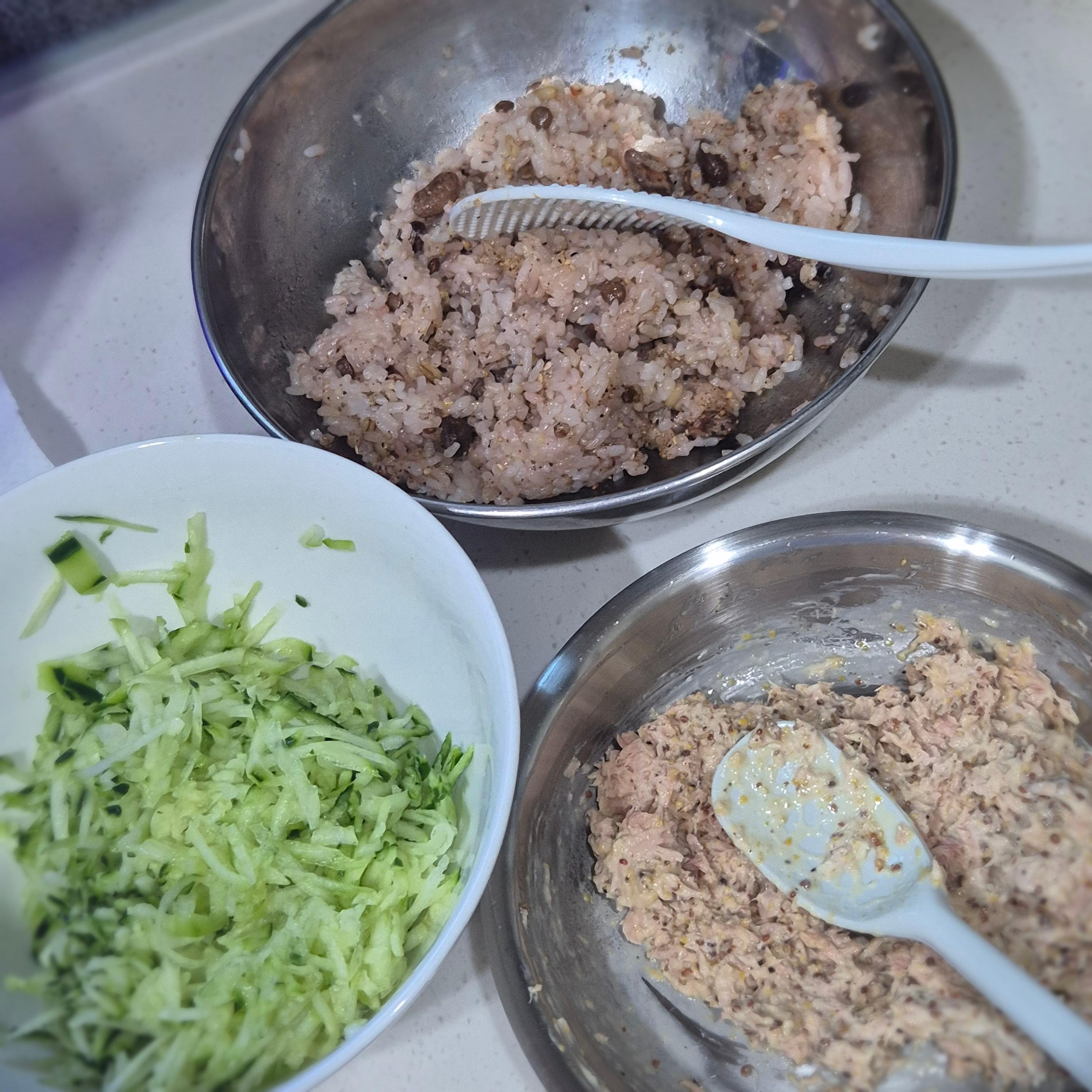 오이 1개는 채칼에 잘 갈아 물기를 쫙 짜줍니다.