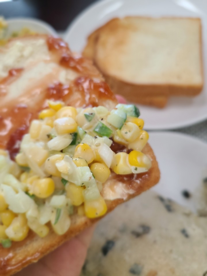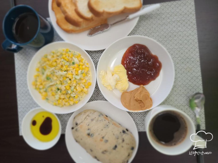 간단하게 콘샐러드 만들기 (feat. 식빵 치아바타 땅콩소스 딸기잼 버터)