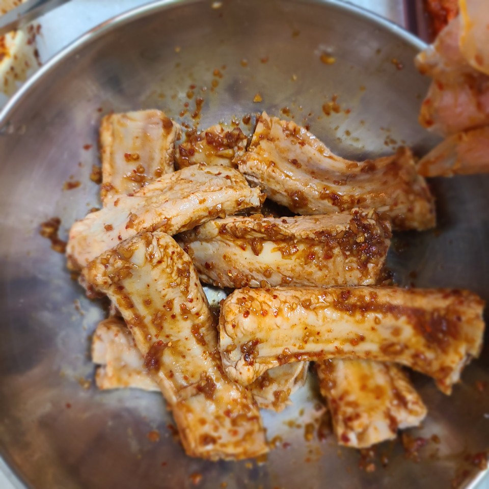 양념장 - 간장 1 , 고춧가루 2 , 설탕 1.5 , 매실액 1 , 후추