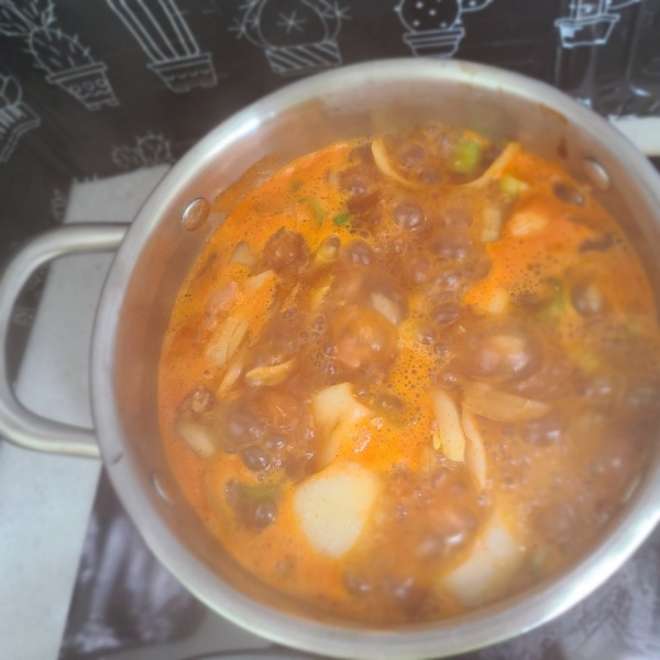 4. 물을 붓고 설탕1 , 고추가루2 , 된장1/2 ,