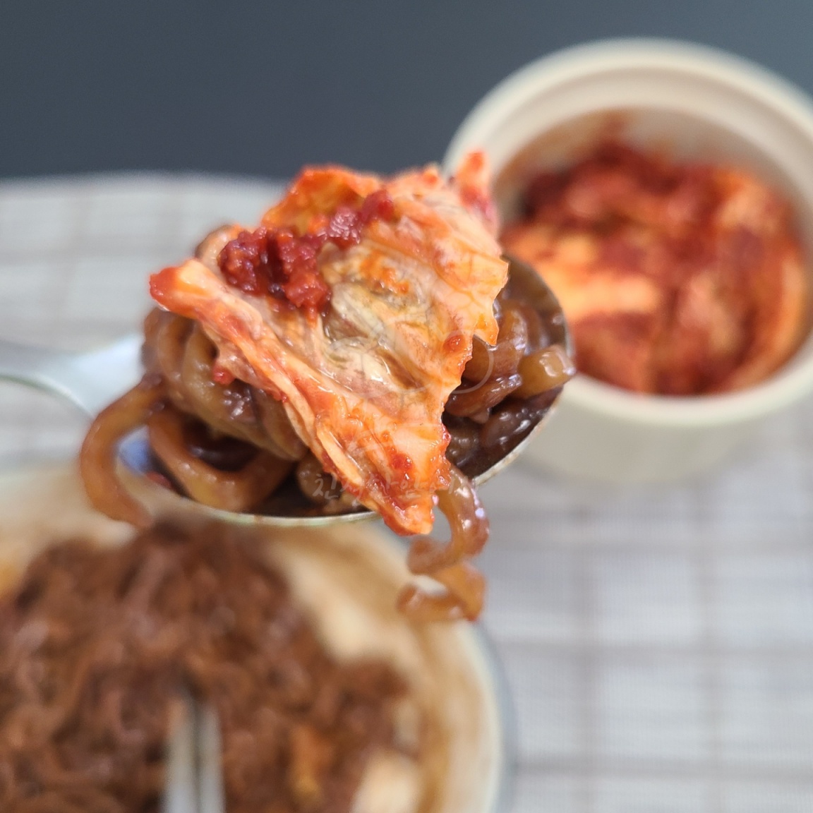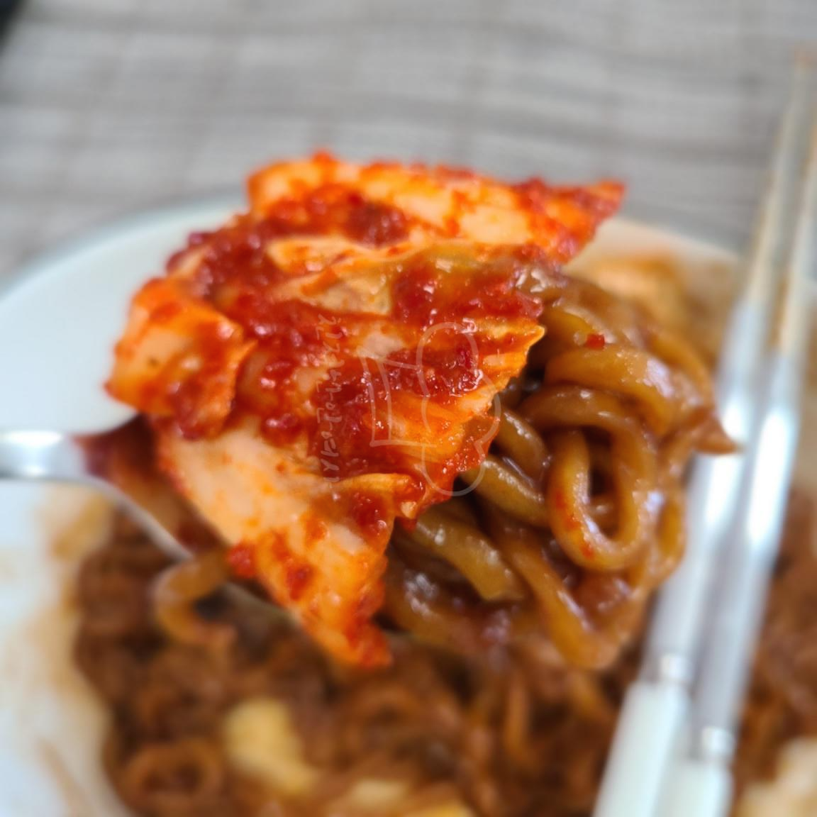 본격적으로 짜파게티에 김치를 얹고