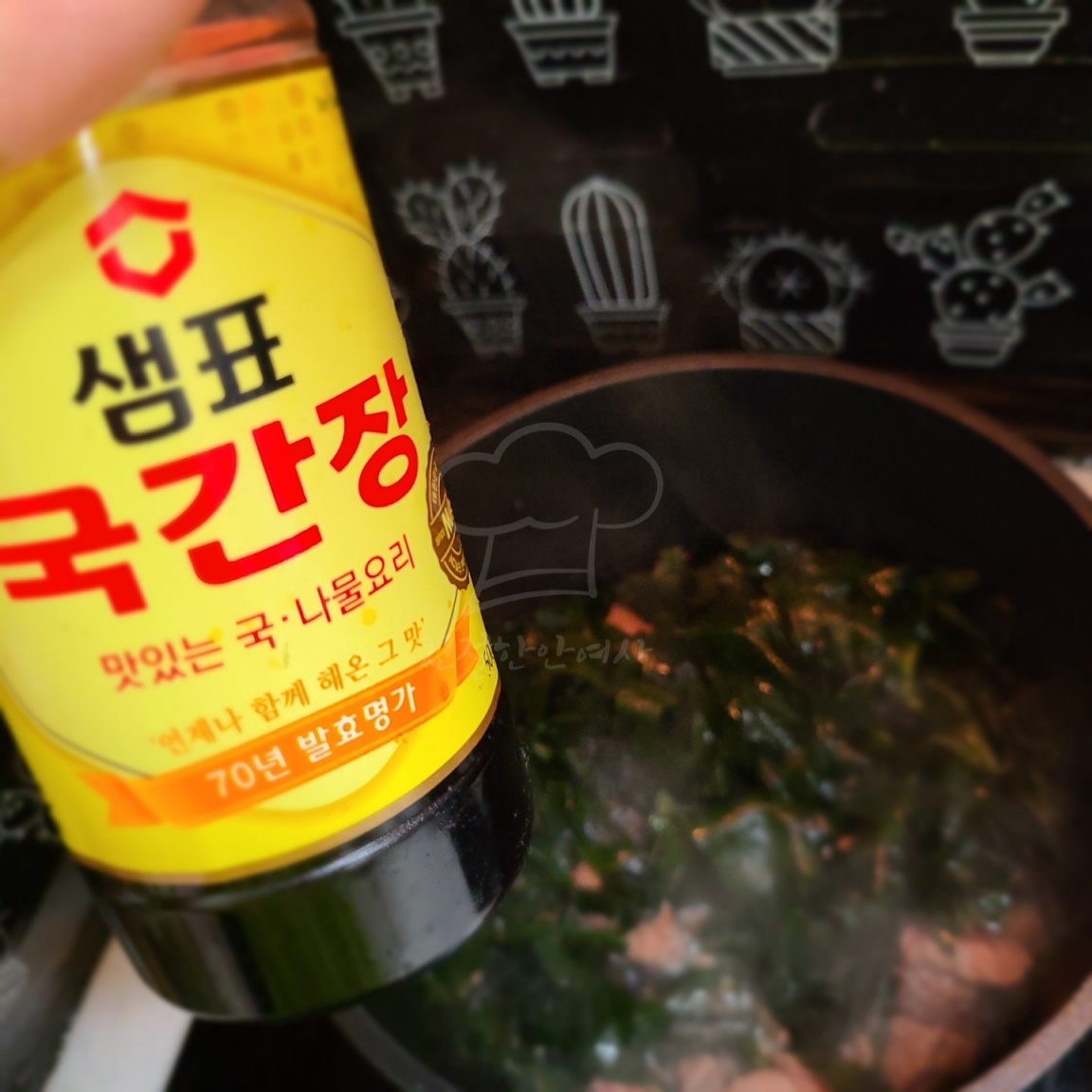 국간장 3T 넣고 살짝 볶아 미역과 고기에