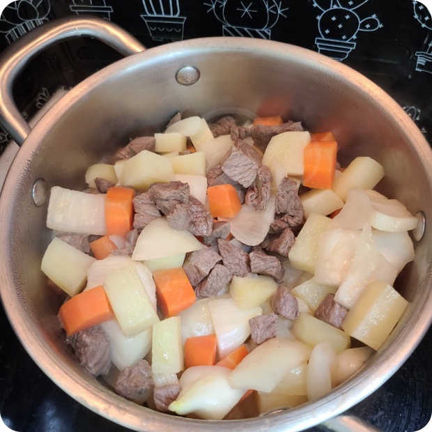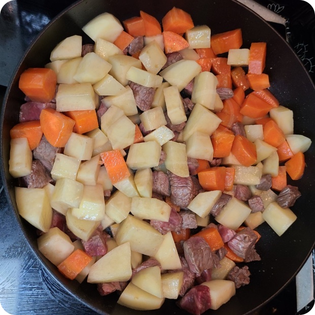 ▶ 감자와 소고기를 넣고 볶아줍니다.