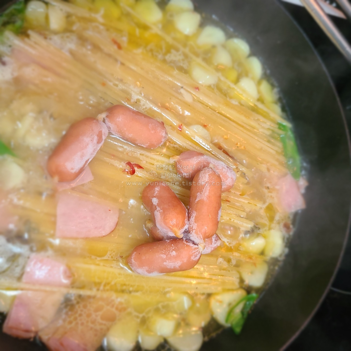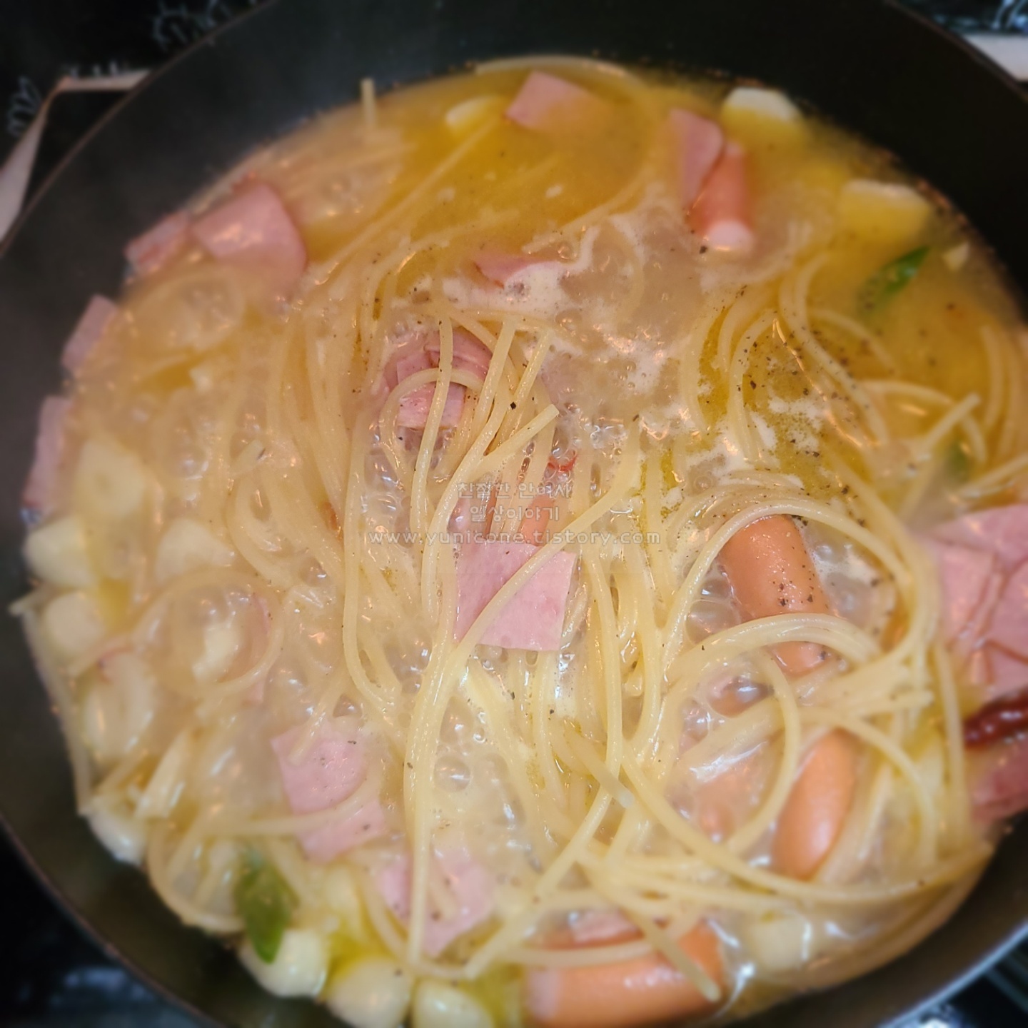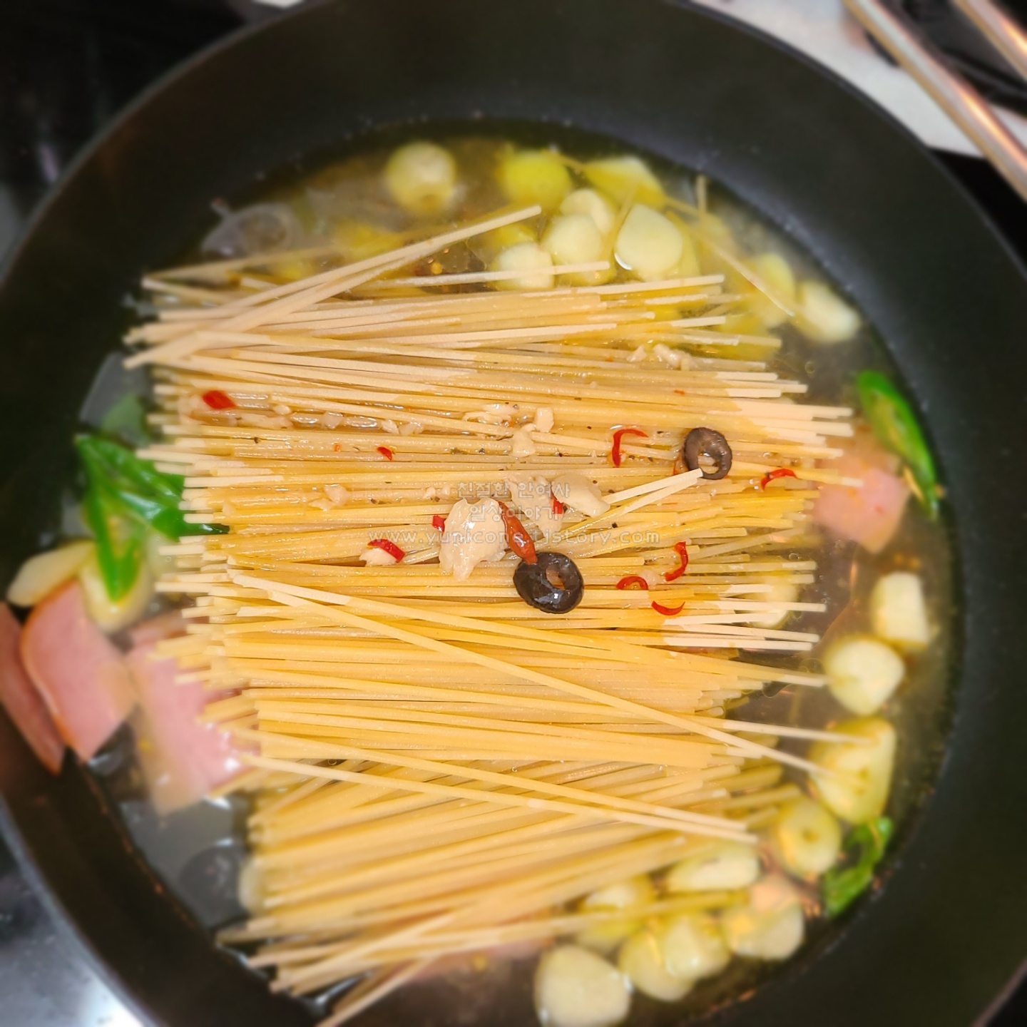 그리고 파스타면을 반 잘라서 넣어주었습니다.