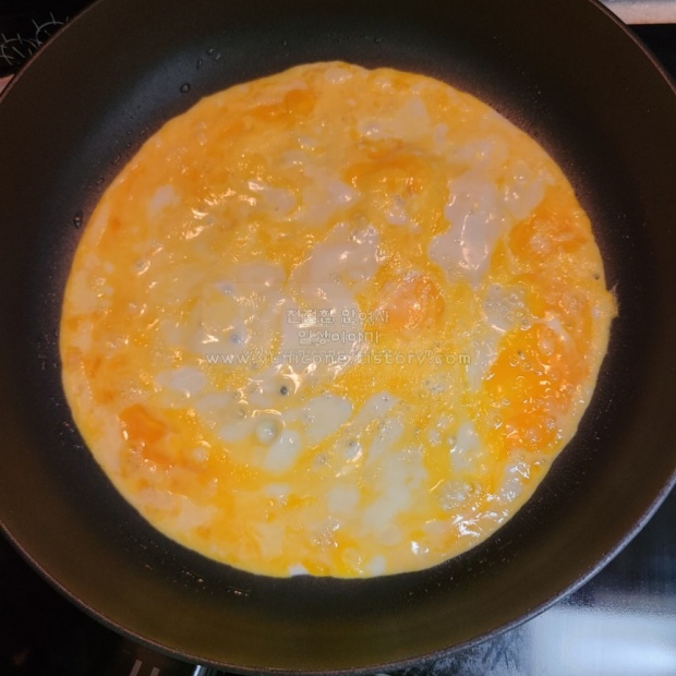 계란지단은 소량의 기름으로 중 약불로 은근히 부쳐주시면 잘 만들어진답니다.