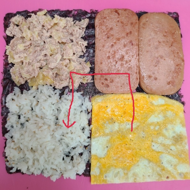 김 , 단무지 , 햇반 , 참치 , 계란 , 런천미트 , 마요네즈