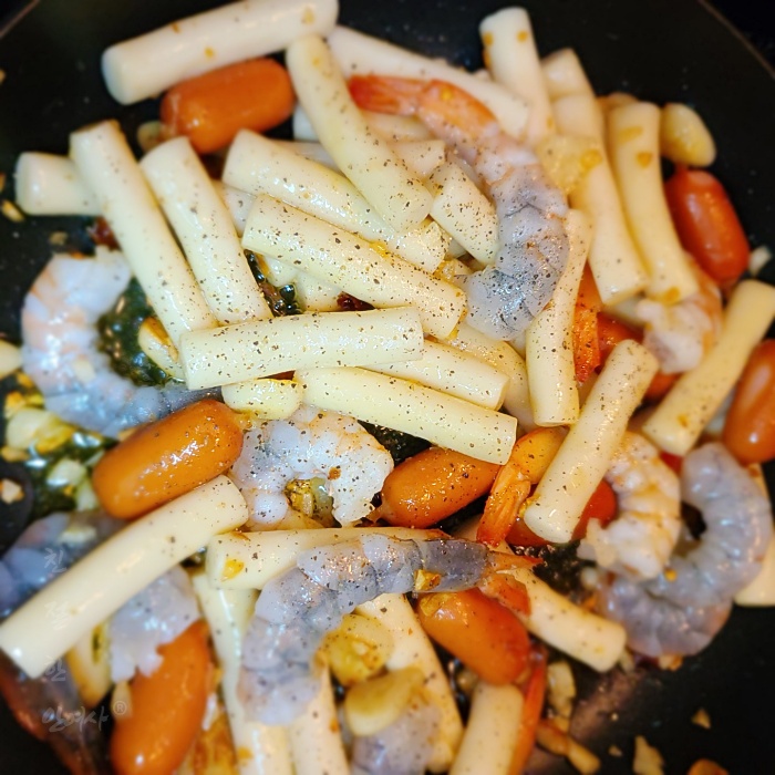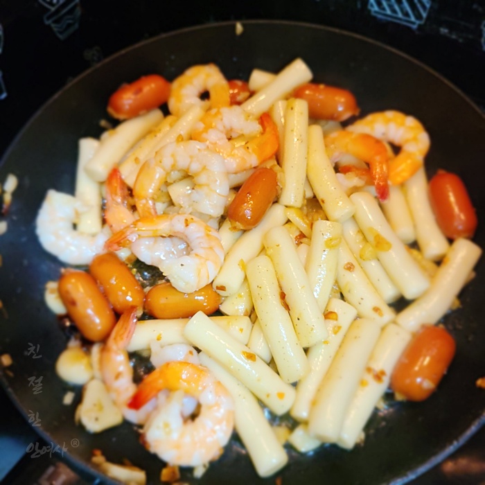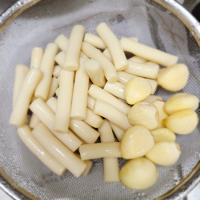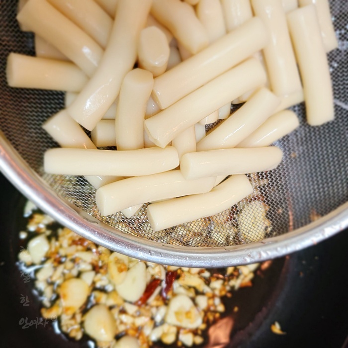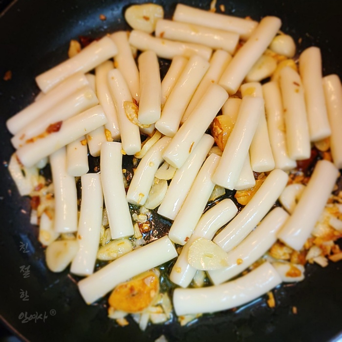 마늘이 전체적으로 익었으면 불을 약불로 바꾸고 떡을 투하!