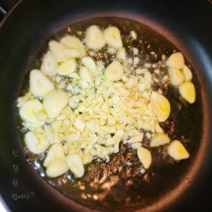 우선 편으로 썬 마늘을 중불에서 볶다가 어느정도 익게되면 잘게 채썬 마늘을 넣고 볶아주세요.