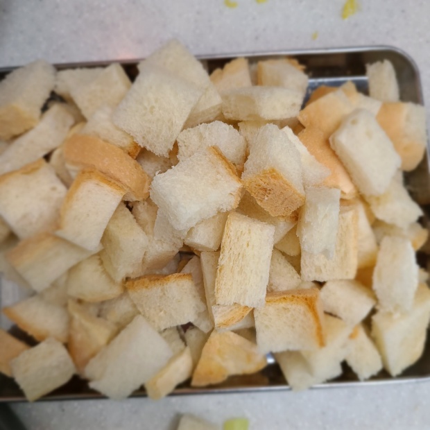 이 식빵들을 가위로 대강 한입크기로 잘 잘라주었어요.