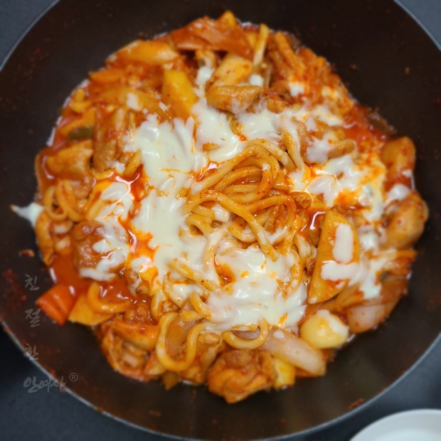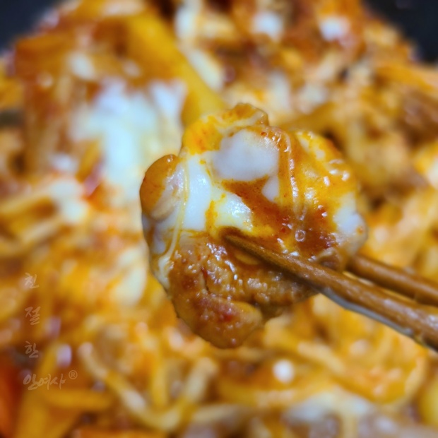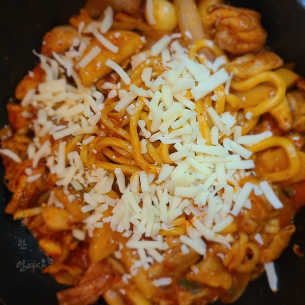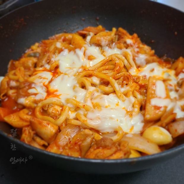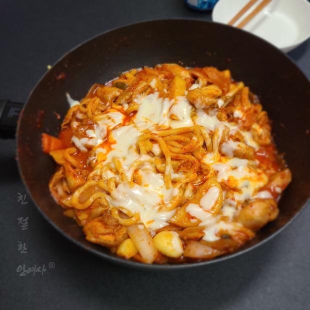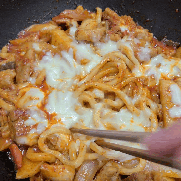 닭갈비와 우동사리에 치즈를 돌돌 감아서 옴뇸뇸뇸