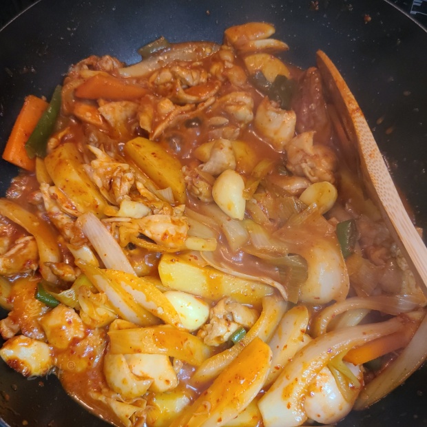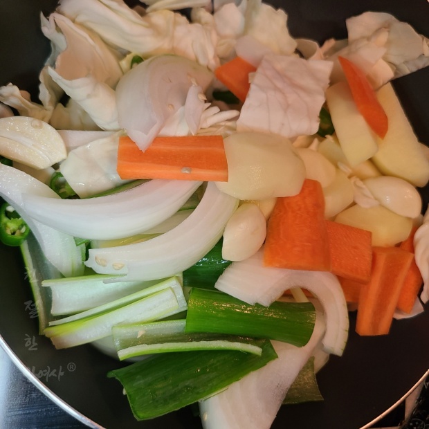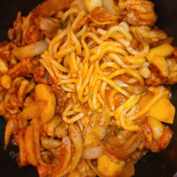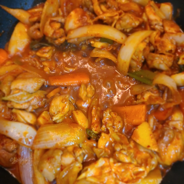 처음에는 강불에서 볶다가 중간불로 바꿔주시면 채소에서 물이 나오게 되는데요 나오는 수분으로 조리하시다가 혹시 물이 부족하다 싶으면 물을 약간 넣어서 감자와 닭다리 살이 익을때 까지 볶아줍니다.
