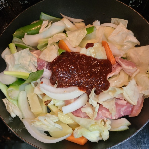 다 익으면 이렇게 중간에 물기가 있게 만들어 주시고(없으면 물을 조금 부어줌)