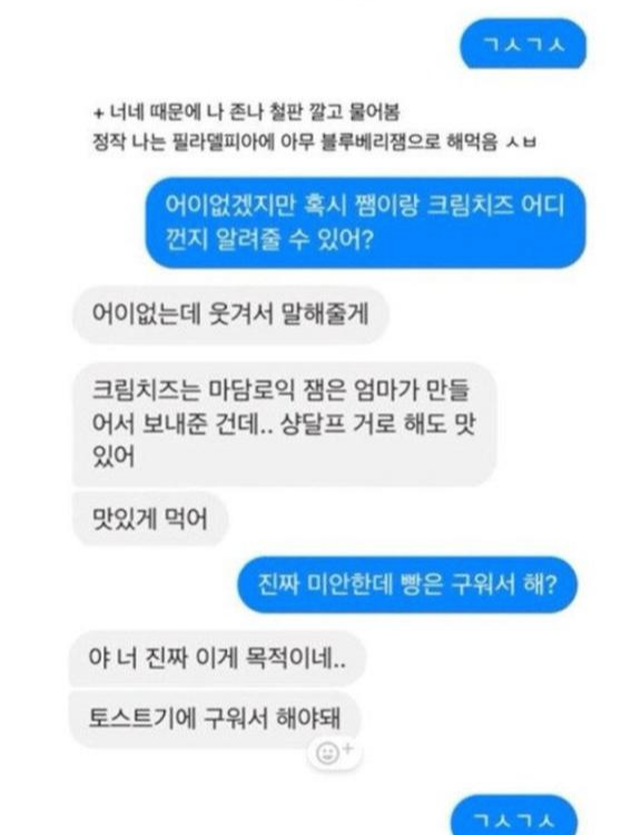 전 남자친구 토스트란 헤어진 옛 연인이 보고싶어서가 아닌 예전에 집에 갔을 때 해주었던 블루베리 토스트를 그리워하는 내용의 카톡을 보내서 한때 SNS에서 핫했던 토스트입니다.