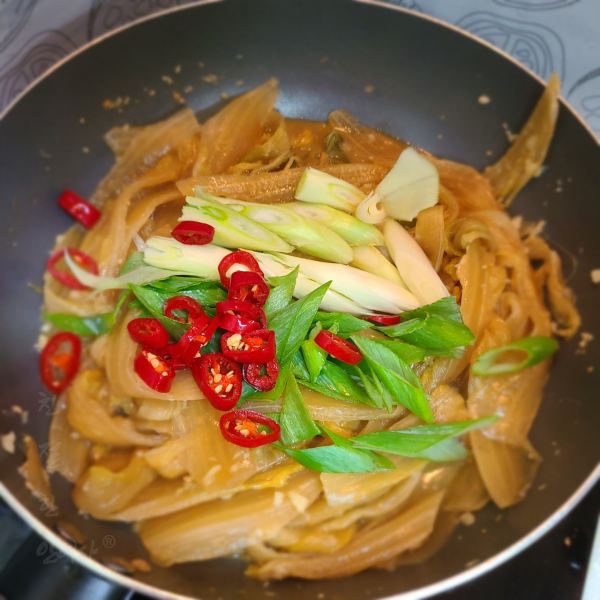 어느 정도 원하는 상태가 되면 홍고추와 대파를 넣고 다시 볶아준 다음 간을 보고 싱거우면 간장을 짜다 싶으면 설탕을 넣어 마무리합니다.