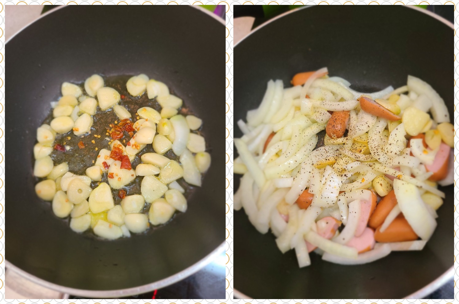그리고 나머지 양파와 비엔나 소시지 그리고 후추를 몽땅 넣어줍니다.