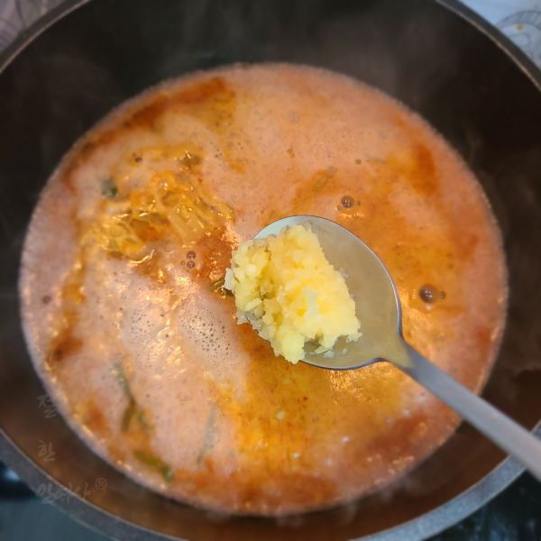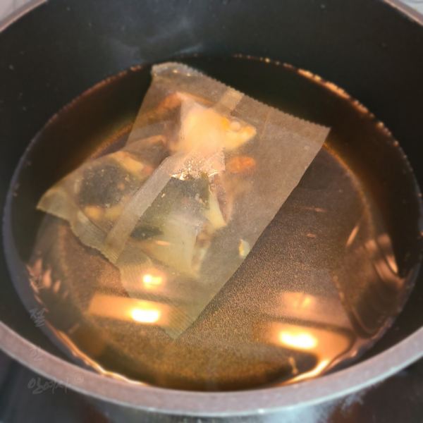 육수가 끓으면 시판용 육수팩을 꺼내고 김칫국물 2국자를 넣어줍니다.