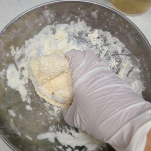 어느정도 섞어지면 손으로 반죽을 해줍니다.