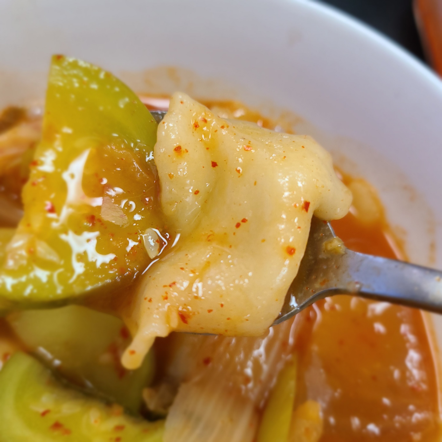 그렇게 조금 끓이다보면 수제비가 투명해지면서 떠오르는데 이때 고춧가루 1큰술을 넣어줍니다.