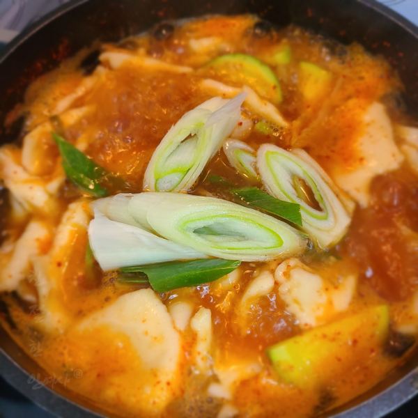 이어서 마지막으로 대파를 넣고 한소끔 끓여 마무리합니다.