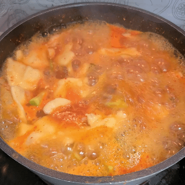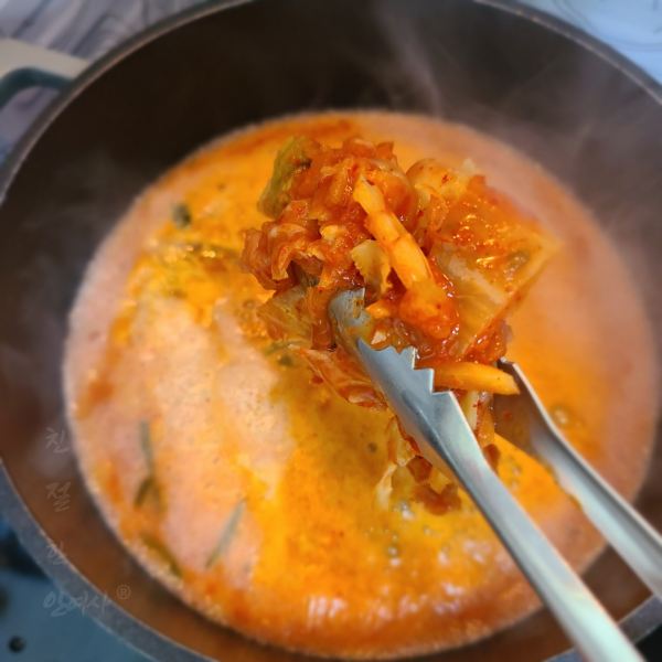 신김치를 넣어 김치가 익을때까지 5분이상 잘 끓여줍니다.