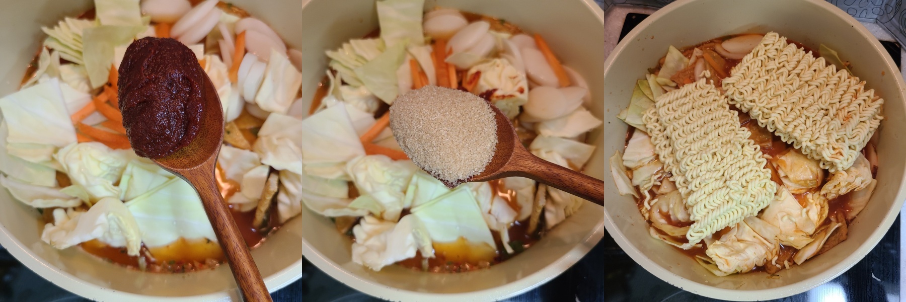 그런다음 고추장1큰술, 설탕 1큰술, 라면을 넣어준다음 잘 풀어주세요.