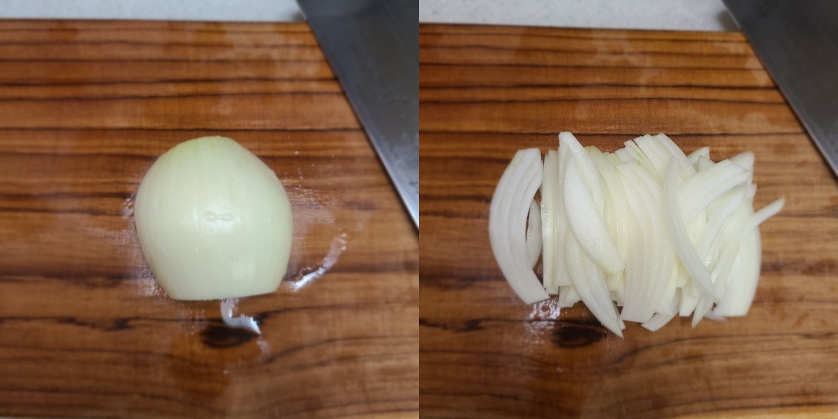 양파 1/2개는 얇게 채를 쳐서 준비합니다.