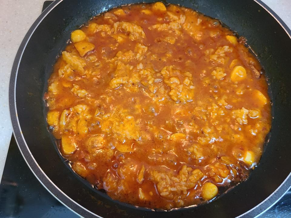 마늘이 다 익으면 물과 시판 토마토소스를 넣고