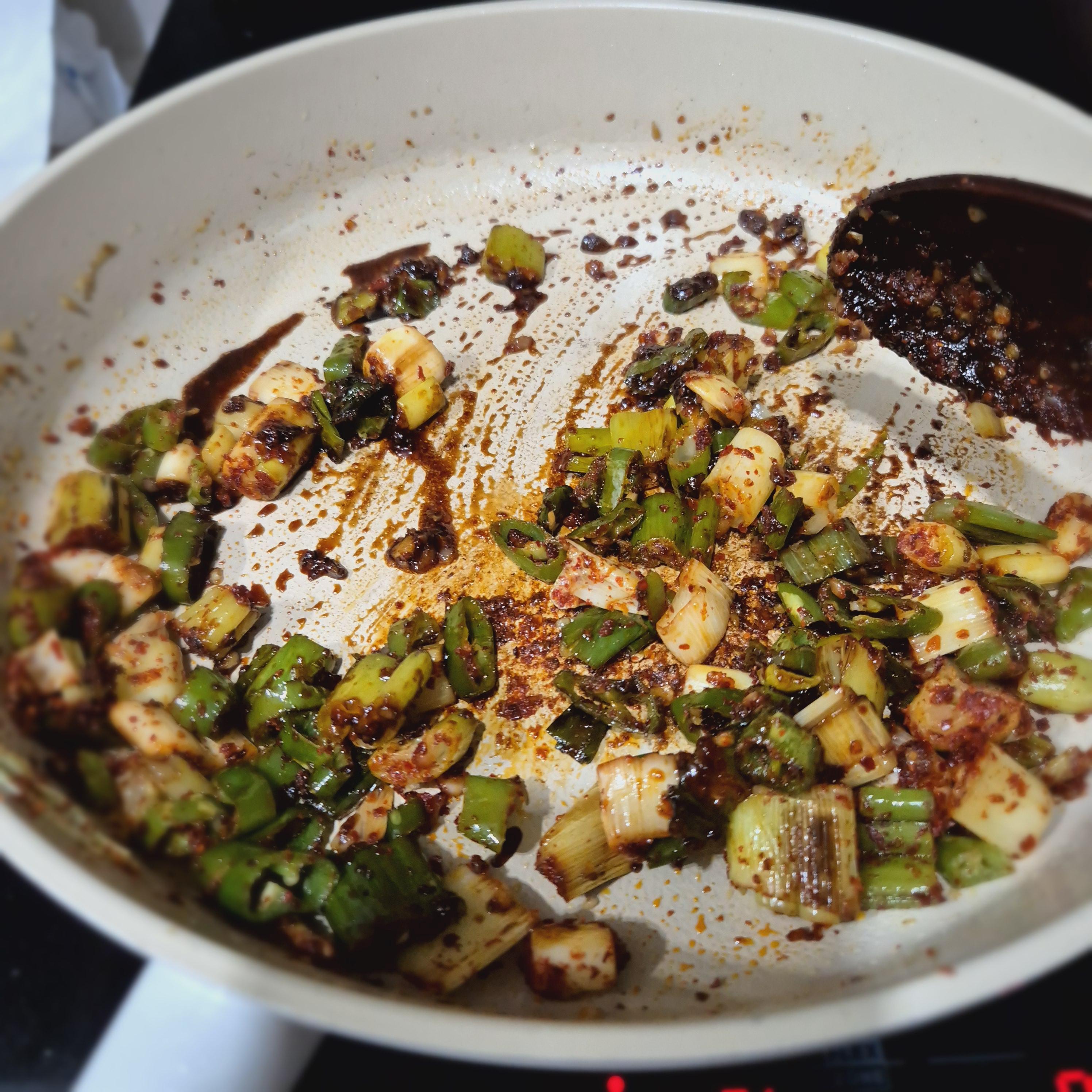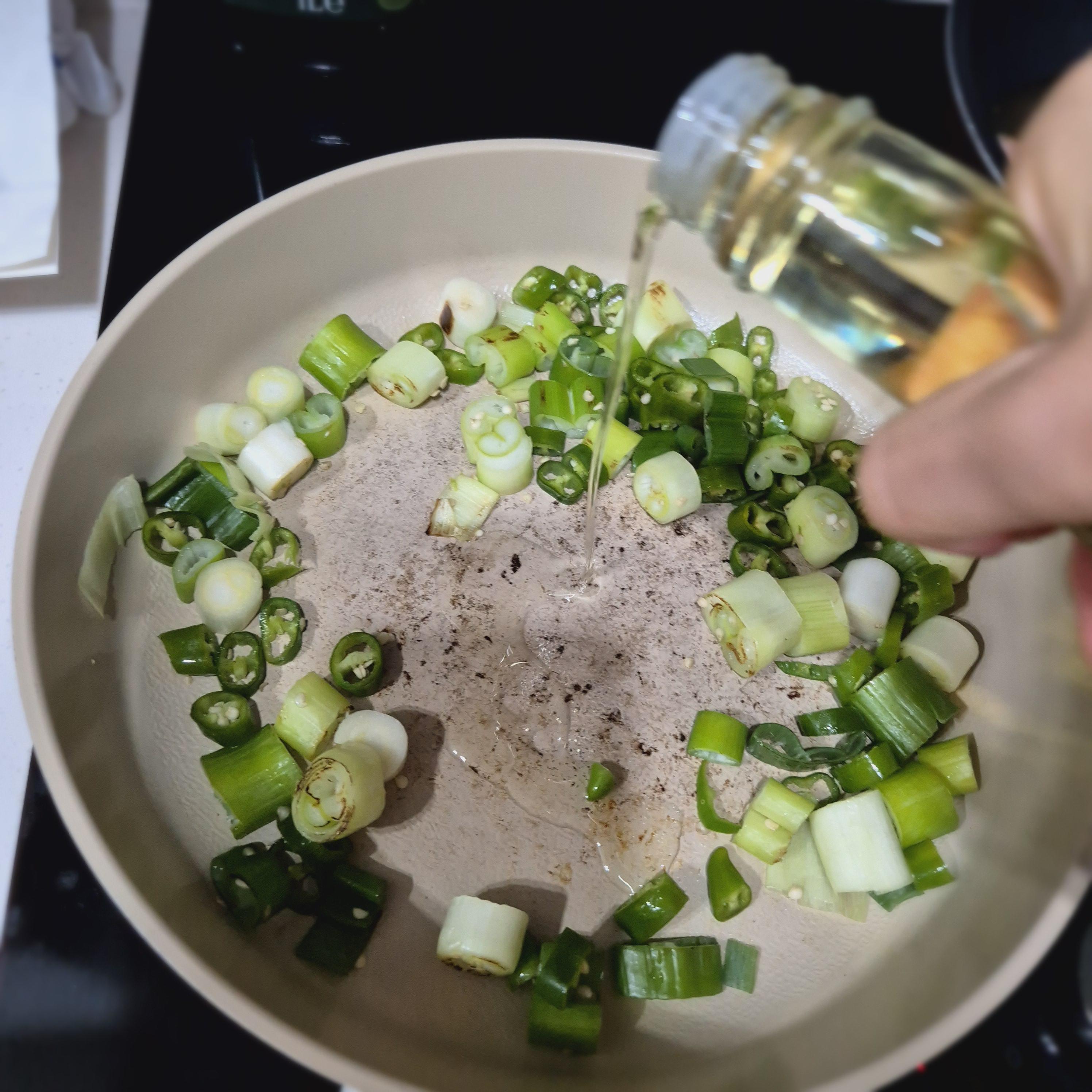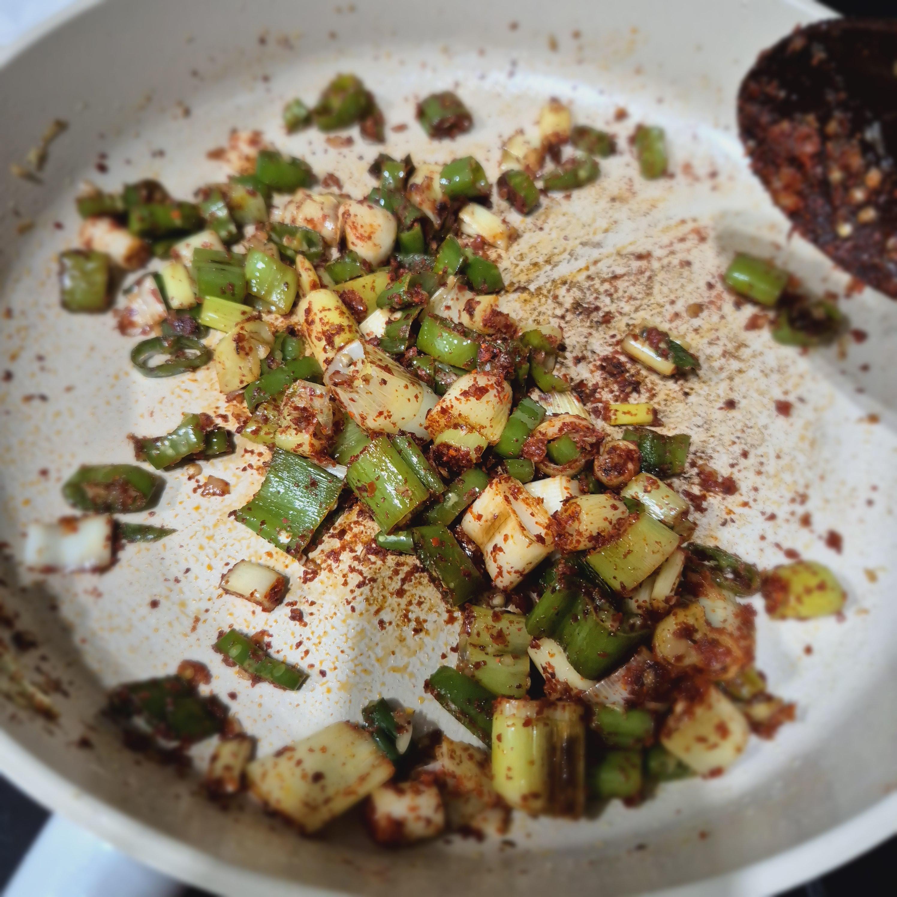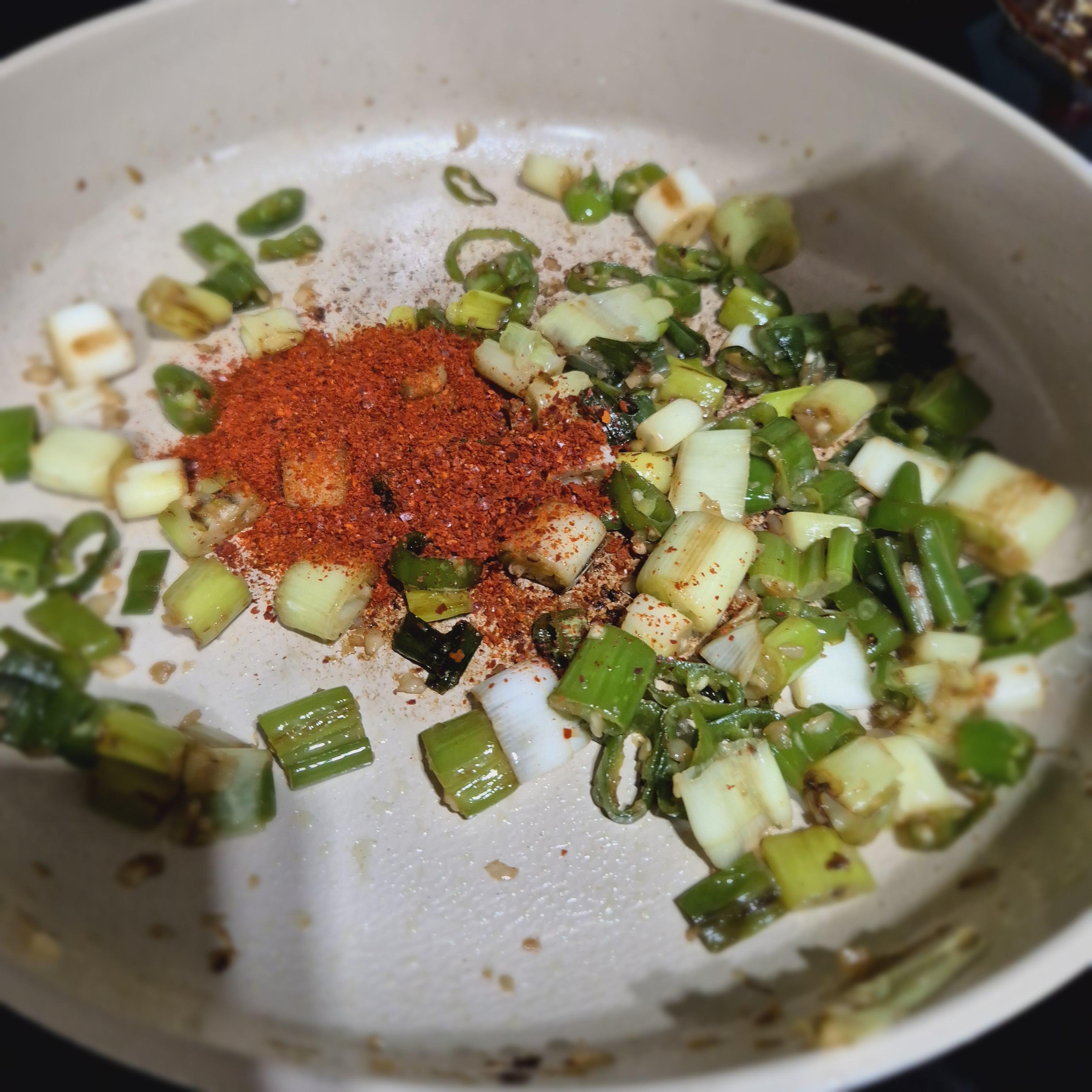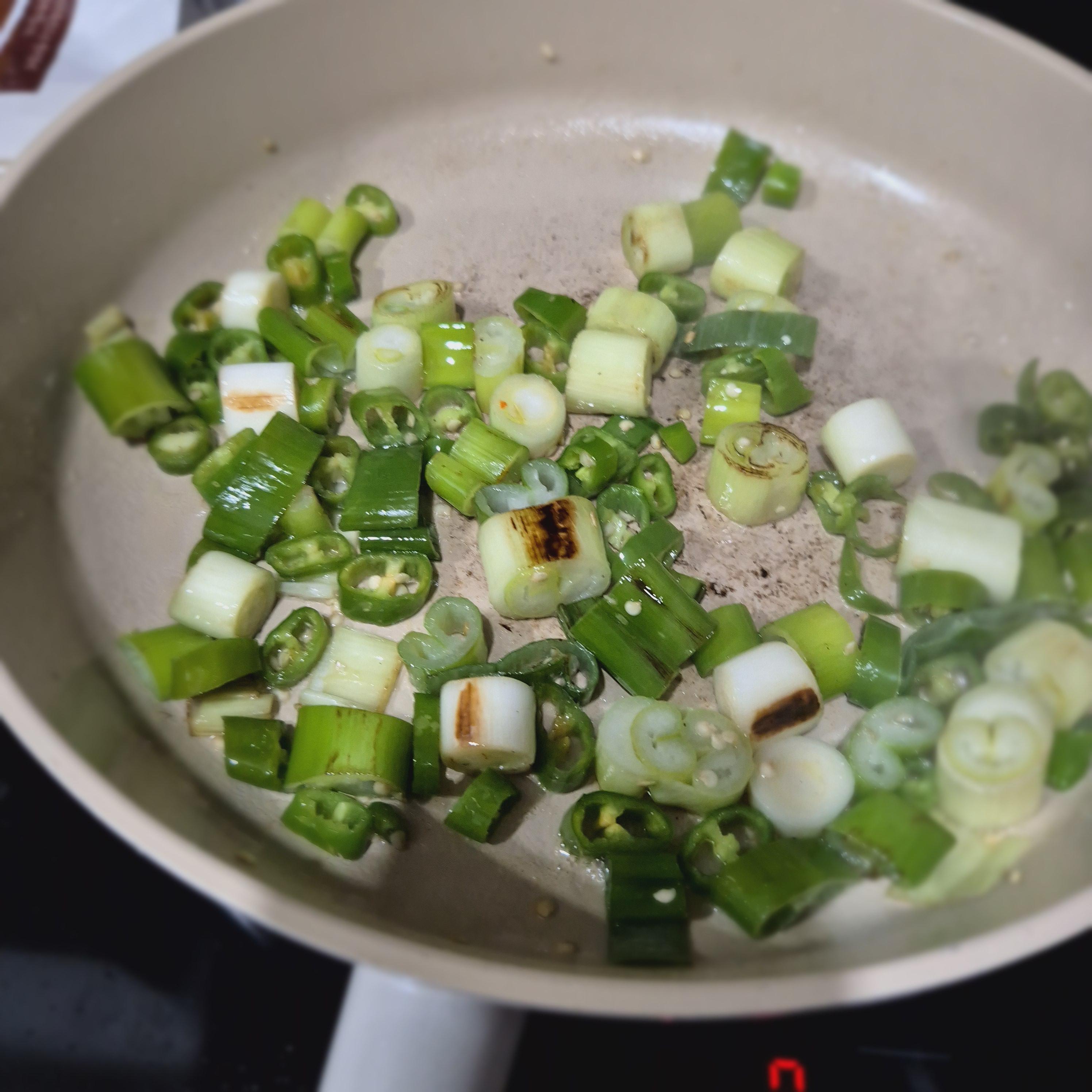 대파가 살짝 노릇해지면 청양고추 투입!