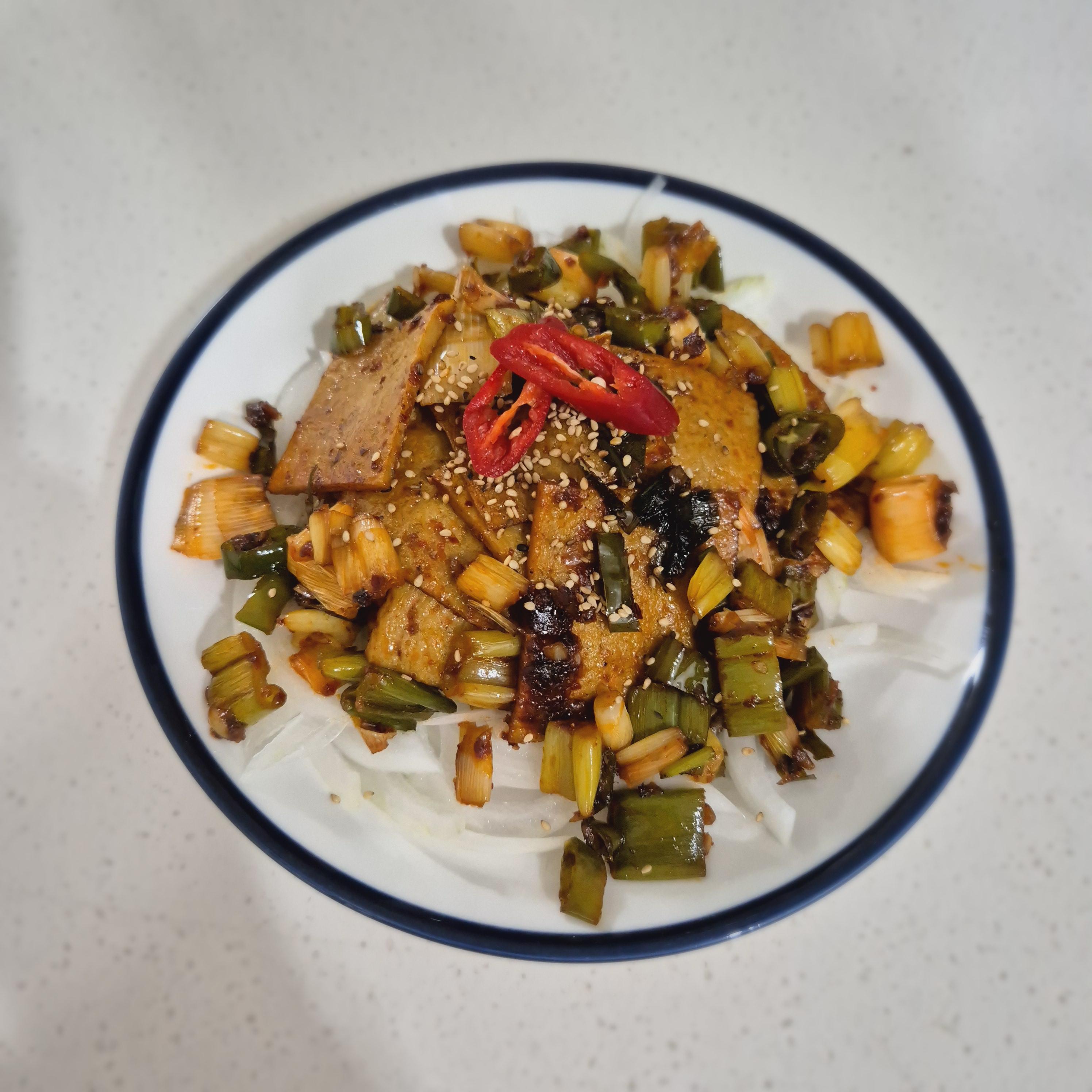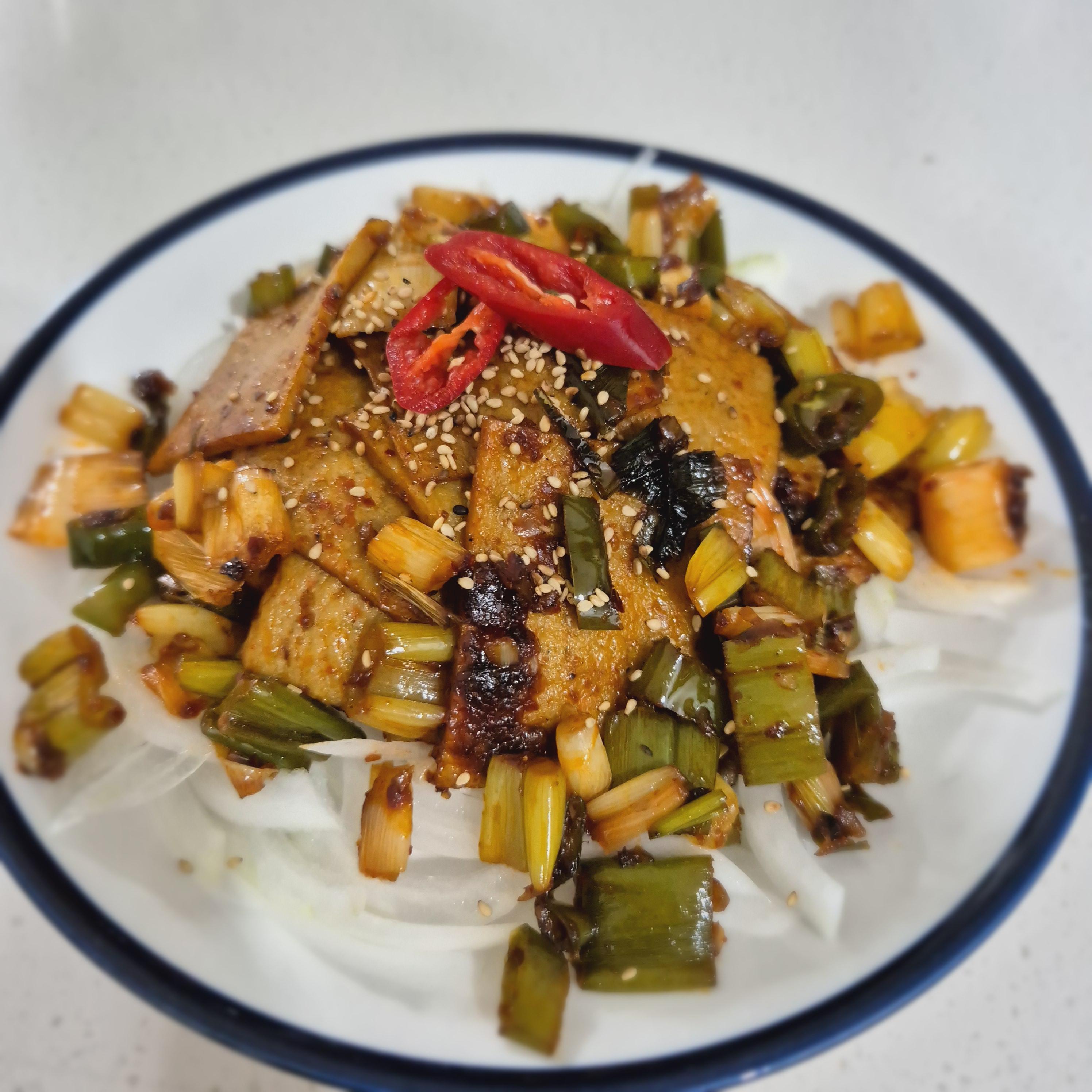 곁들여먹기 좋은 양파채를 바닥에 깔고 어묵제육을 올려주었습니다.
