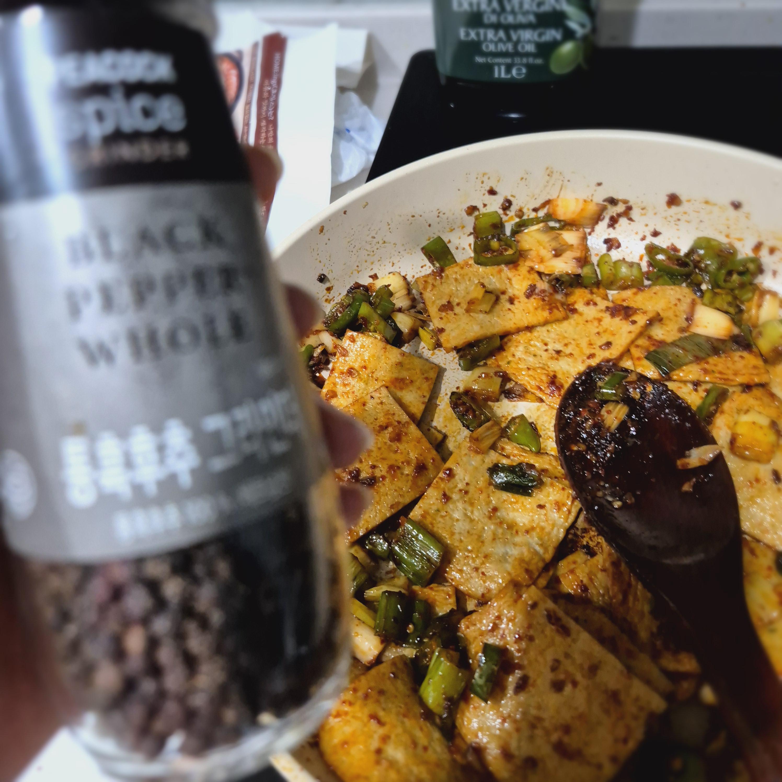 후추 10바퀴와 참기름 1큰술 넣고 약불로 줄여서 볶아줍니다.