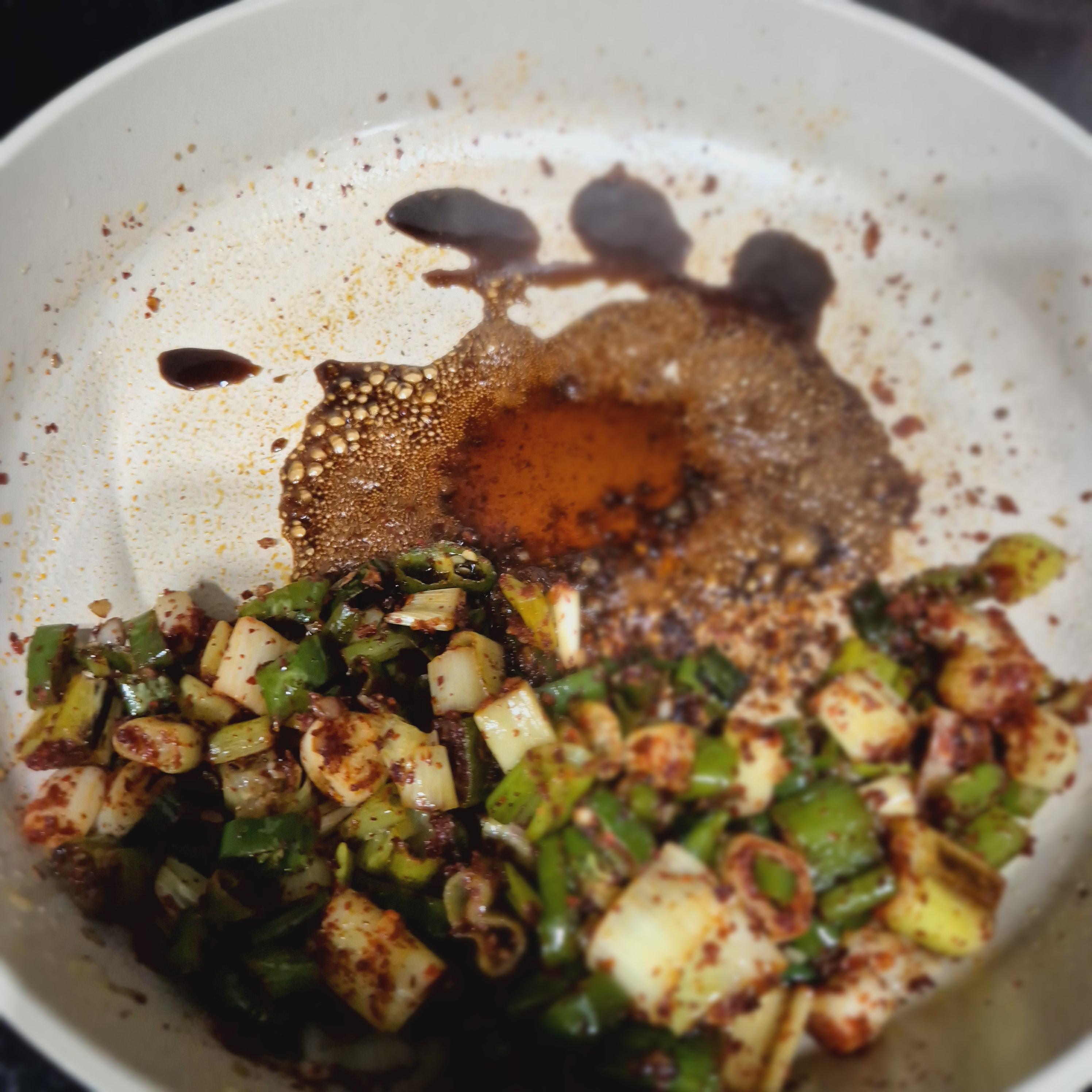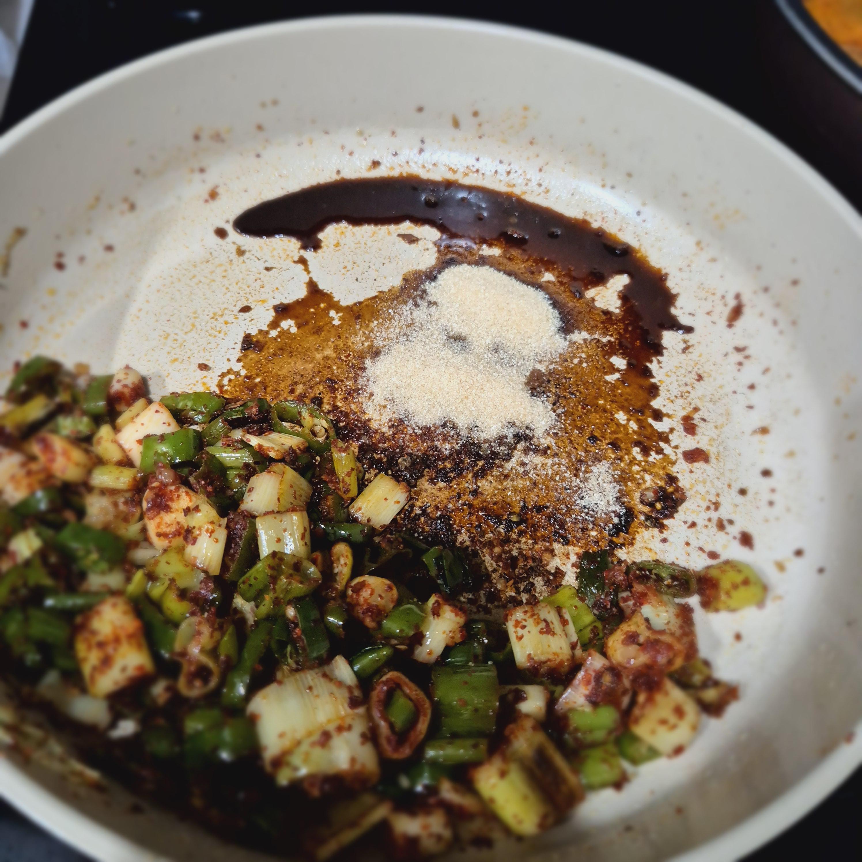 그리고 빈 공간 만들어 간장 1.5큰술 넣고 간장을 살짝 끓여주는데 이는 풍미를 높이고 비린내와 잡내를 잡아주기 위함입니다.