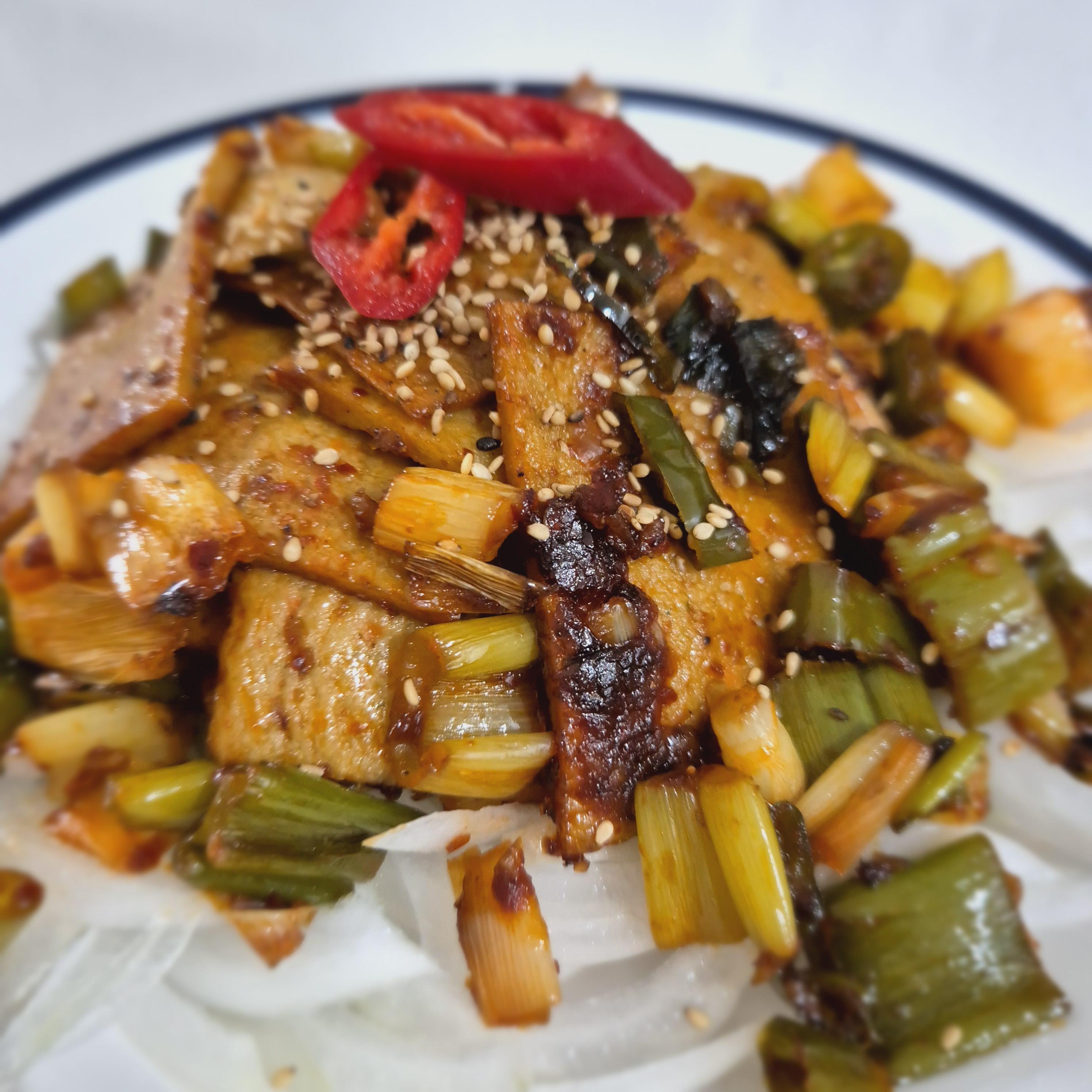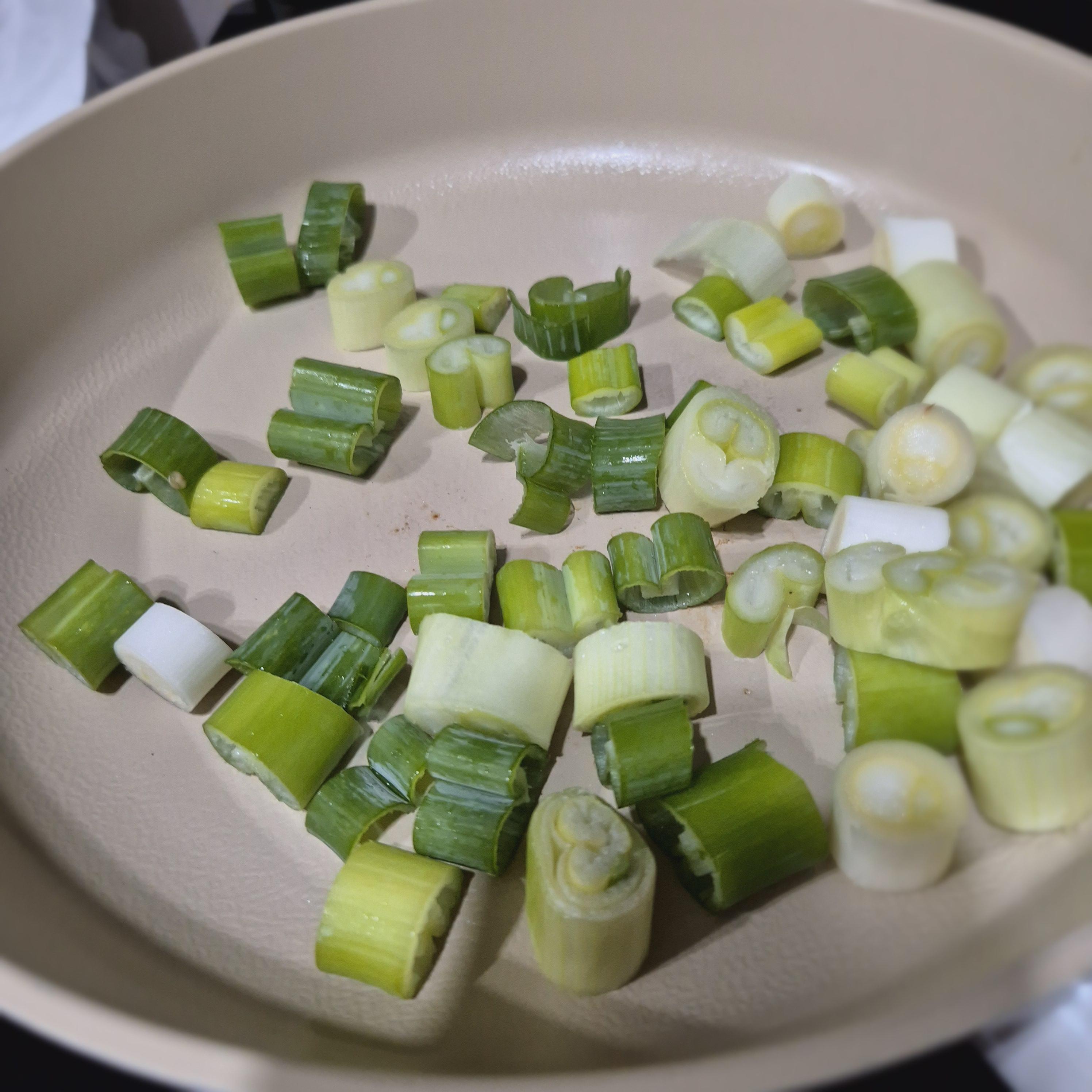 강불로 달군 팬 위에 대파를 넣고 볶아줍니다.