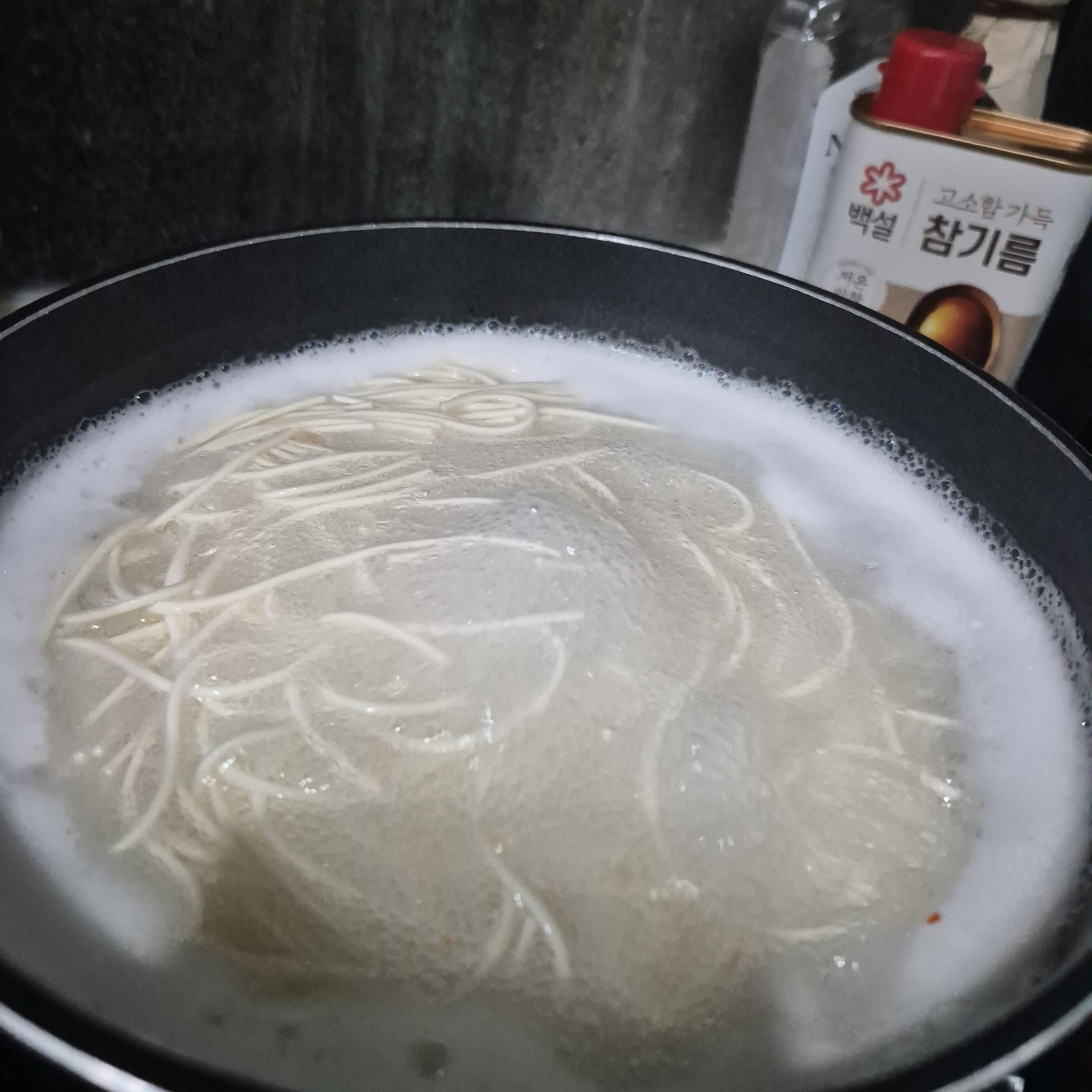 중간에 끓어 넘치려고 하면 찬물을 부어주는걸 3번 정도 반복하면 탱탱한 면발을 만들 수 있어요.