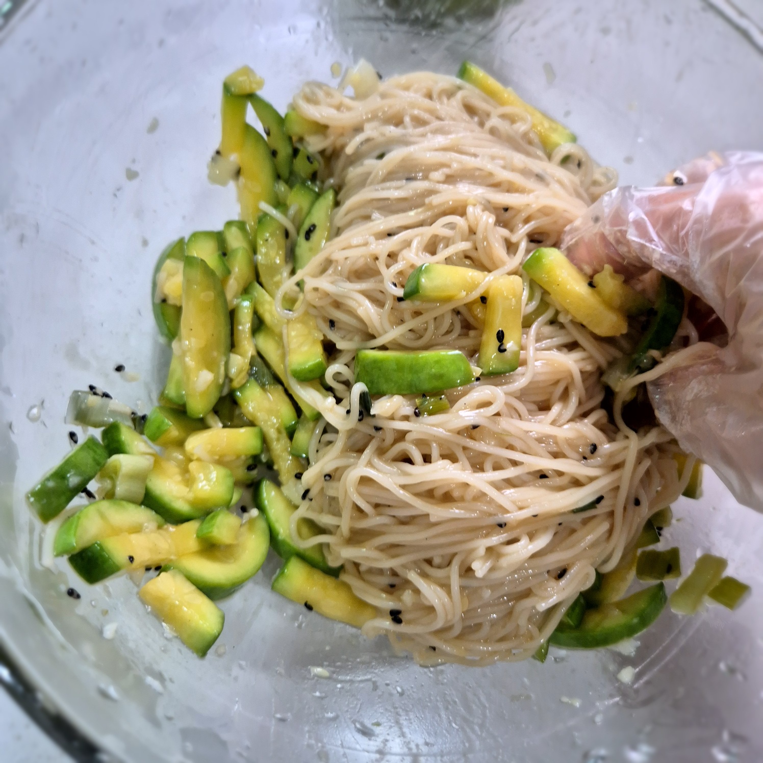 그런 다음 믹싱볼에 넣고 애호박 간장비빔국수의 양념장을 적당히 부어서 비벼주신 후 간을 보면서 간장을 넣어줍니다.