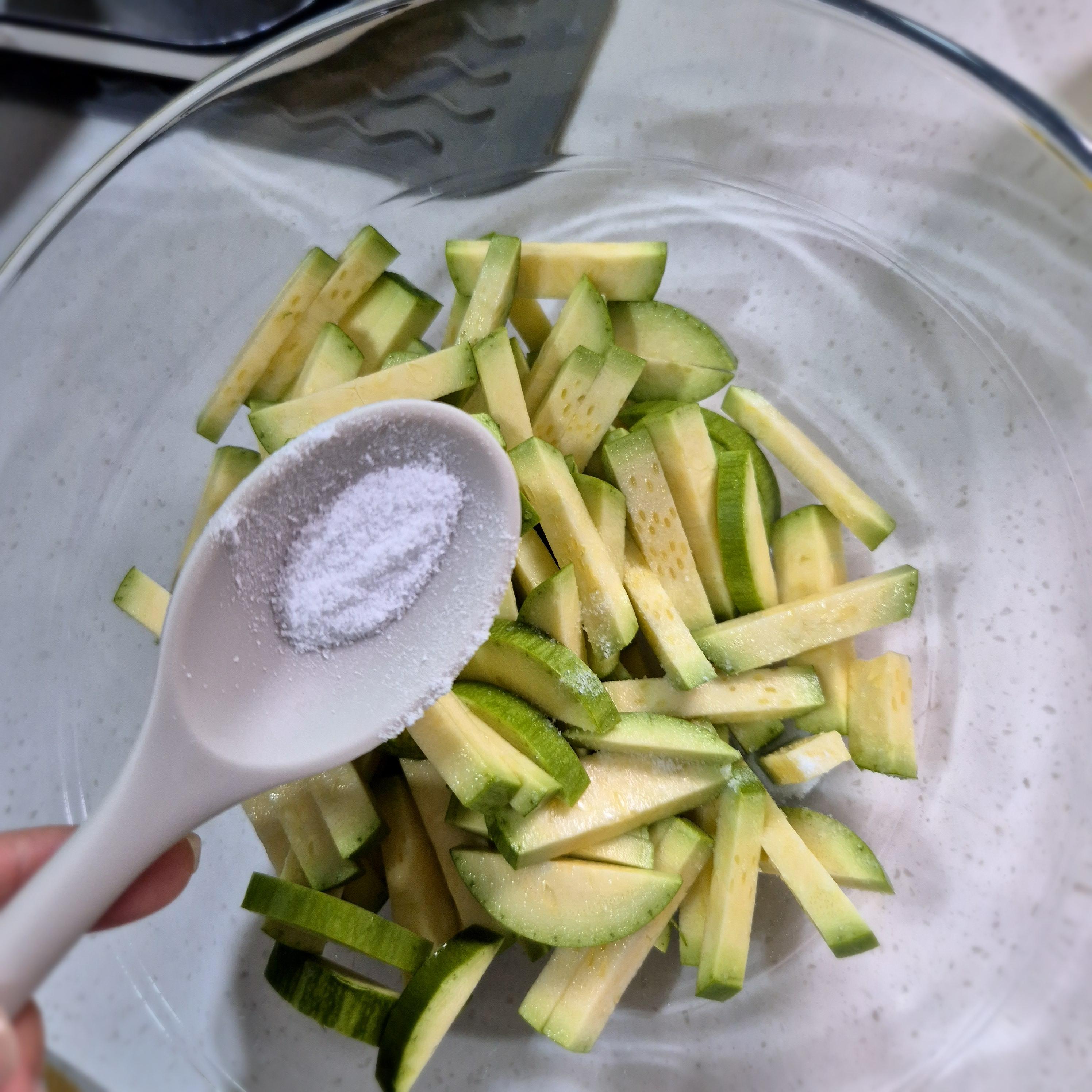 잘라놓은 애호박은 소금 반 큰 술 넣고 절여줍니다.